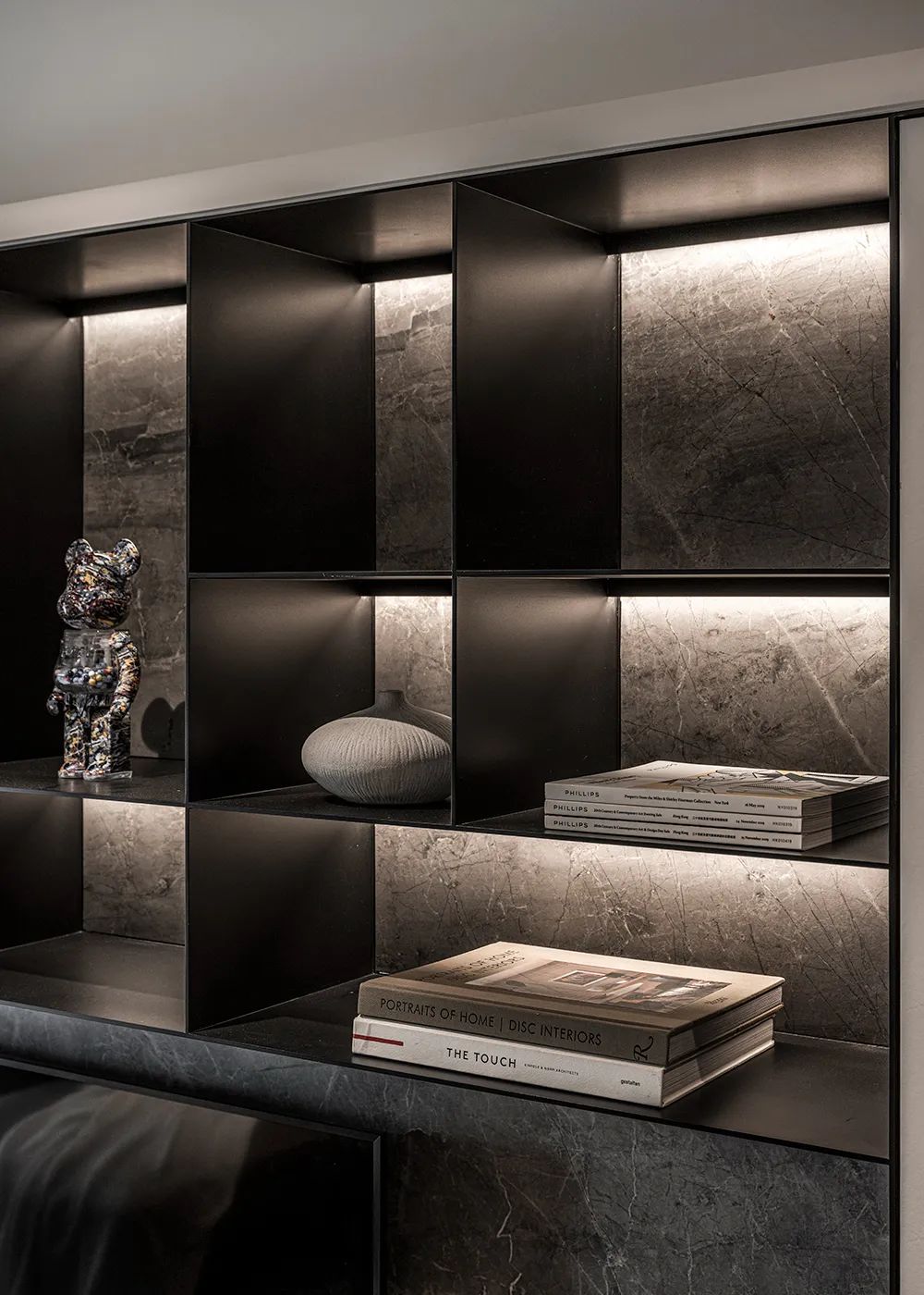 延续了他喜爱的风格,以沉稳石纹搭配铁制书架