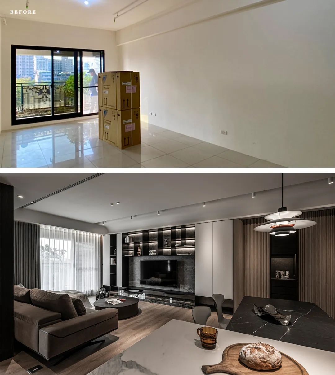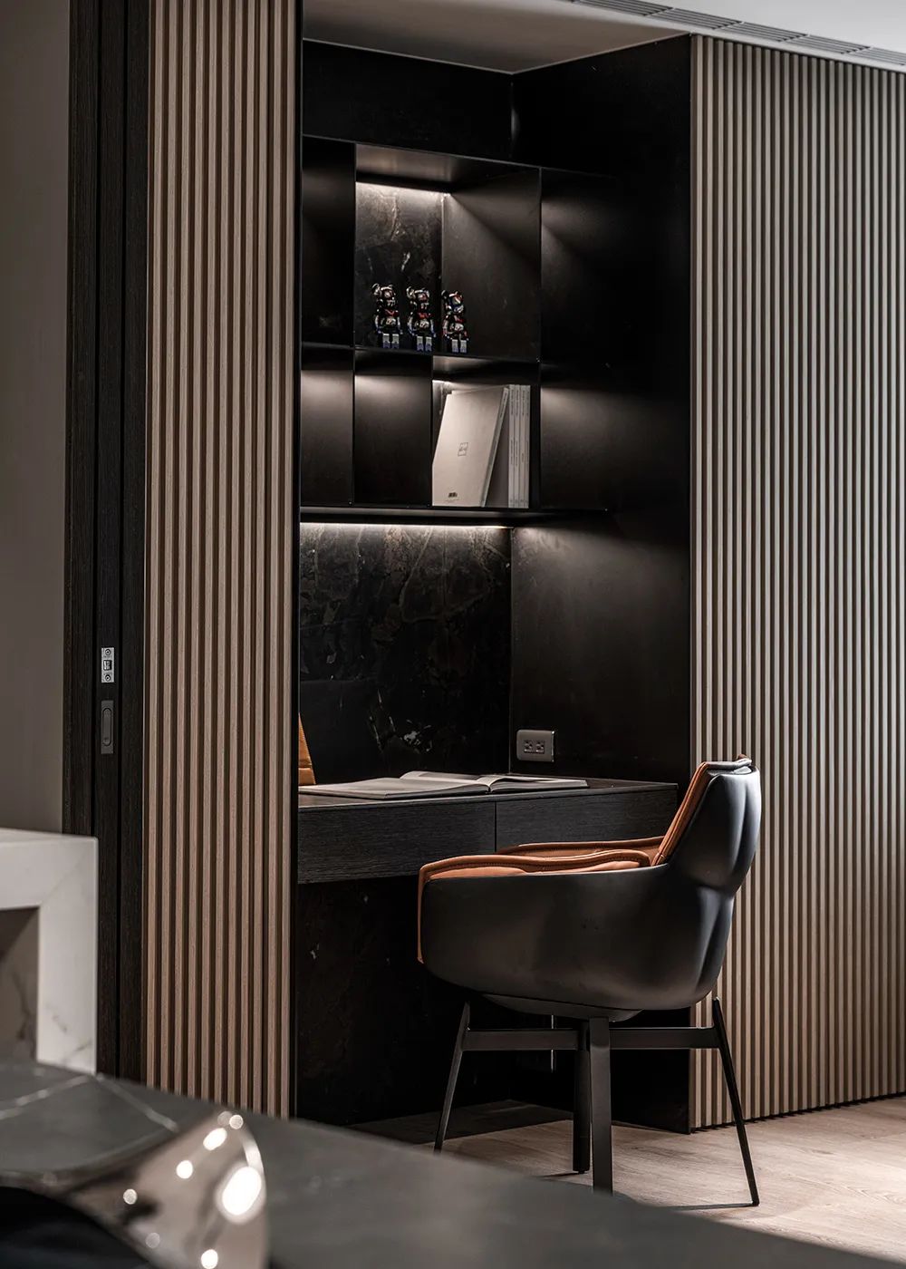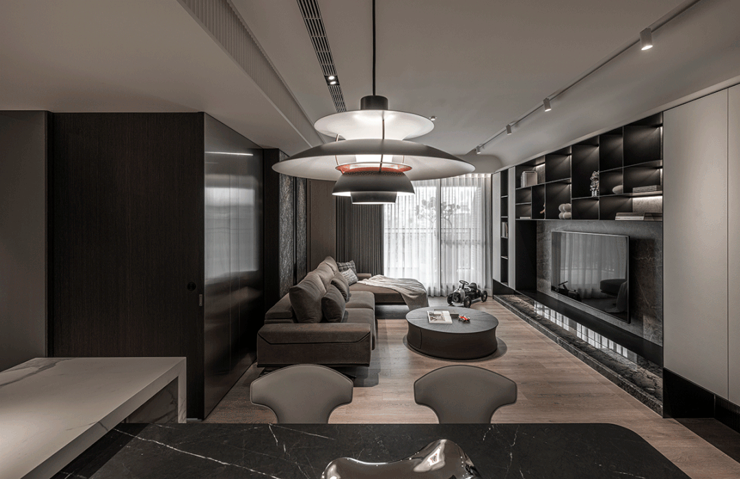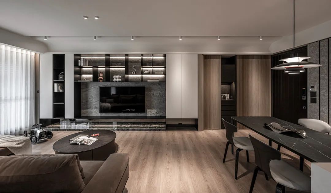 电视墙交织着石材、铁件、镜面、灯线,更在黑白、开放与封闭之间