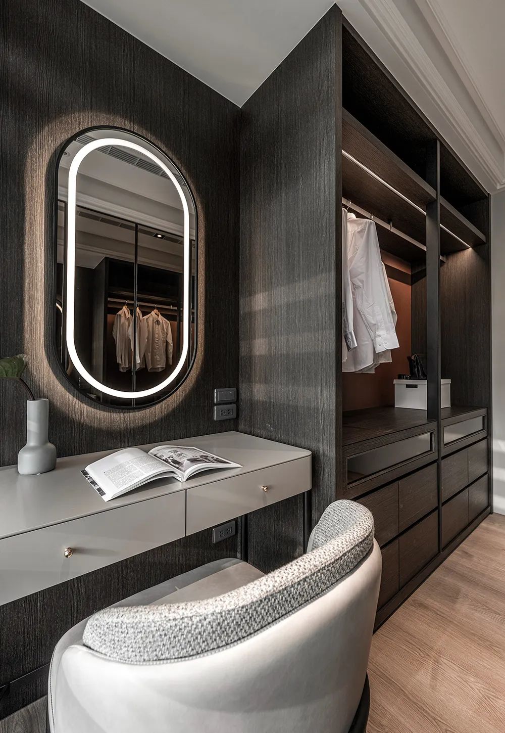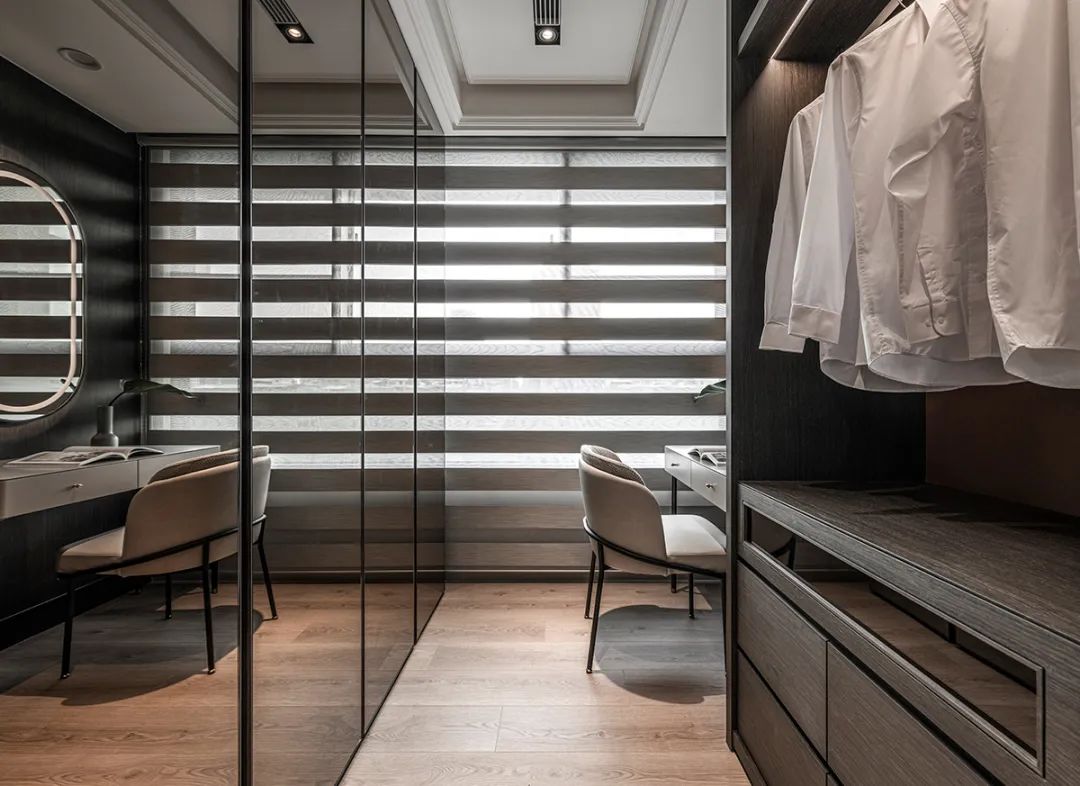 步入更衣室时,双面柜体的深度行程一段分明的过道