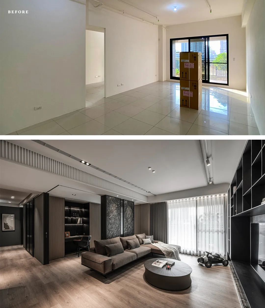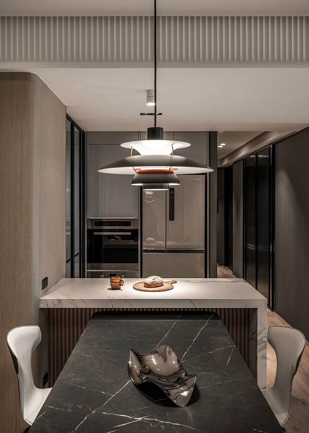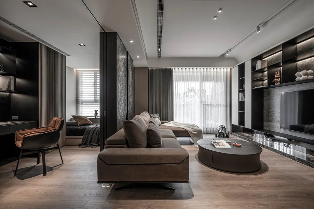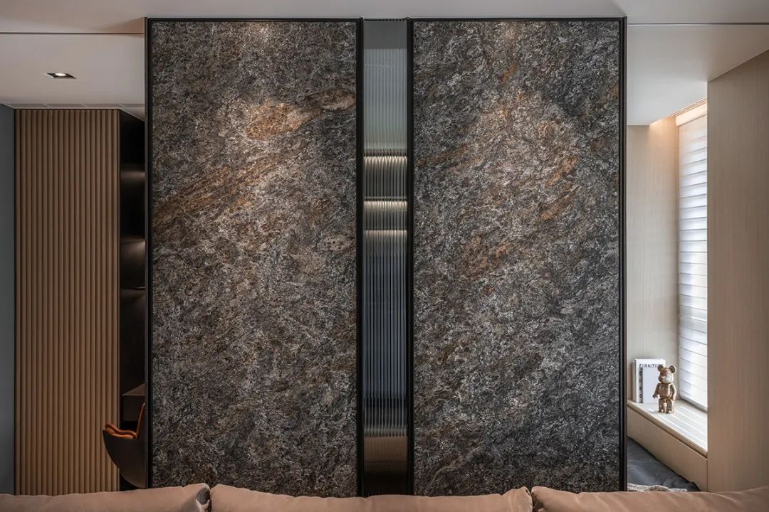 以柔软肌理平衡茶玻、铁件与石材