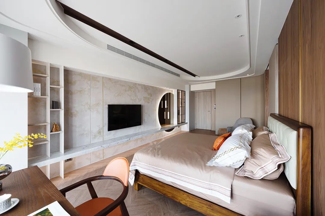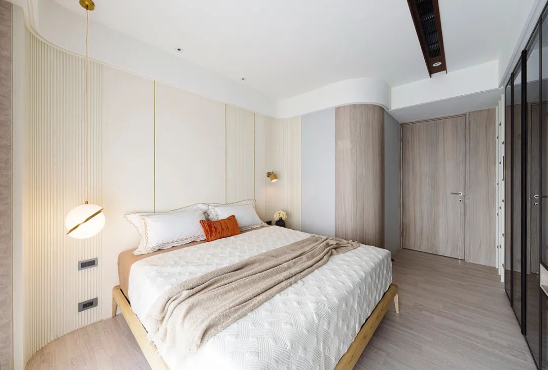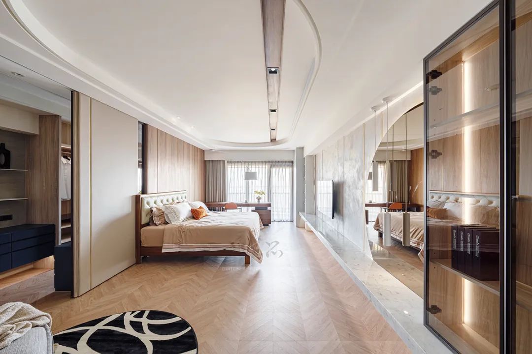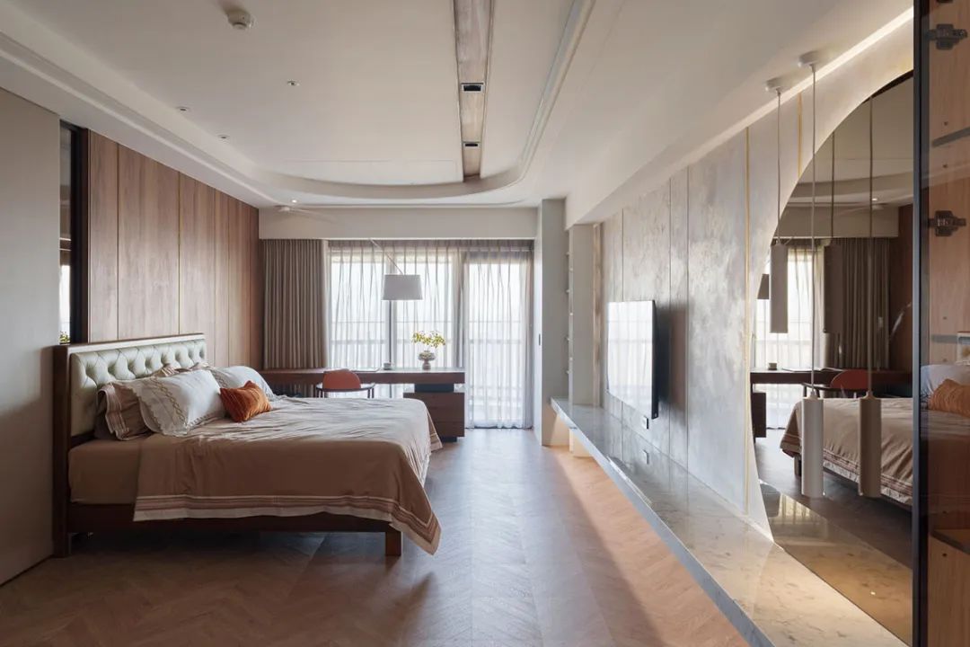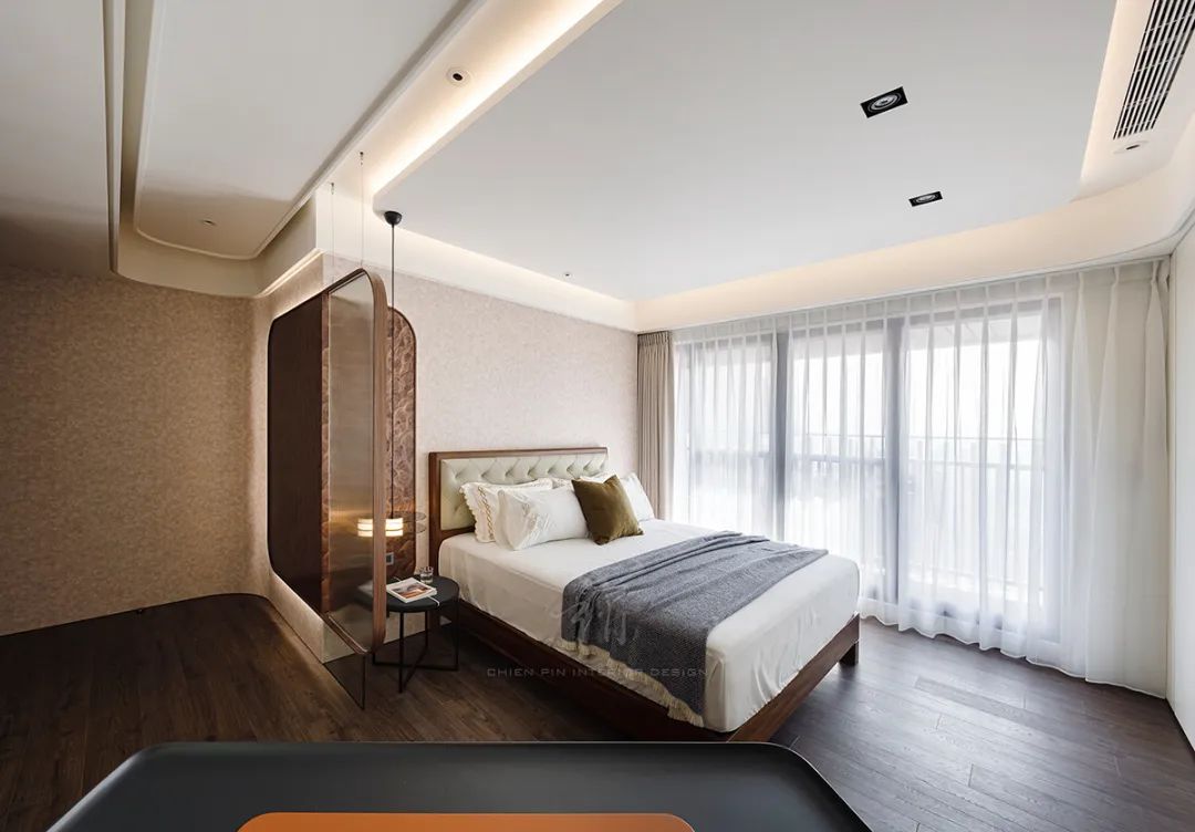 搭载波浪状的纱帘与圆弧天花,注入柔和圆润感