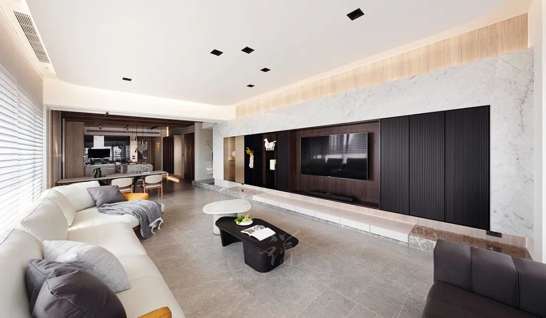 左侧设有开放展示柜便于屋主摆放家饰品,灵活变化出一隅端景