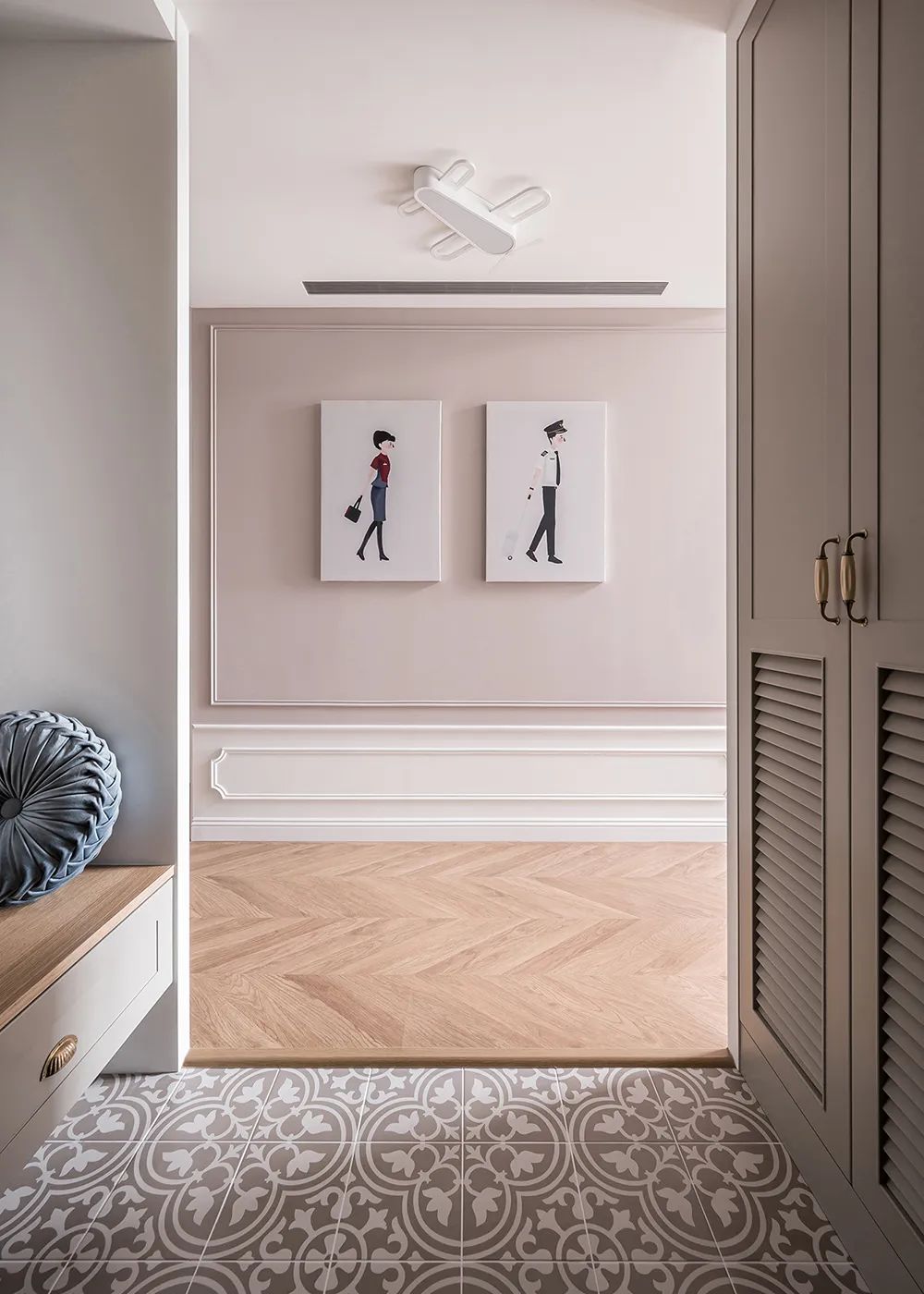 对侧悬空式的一字形穿鞋椅结合抽屉,赋予收纳机能