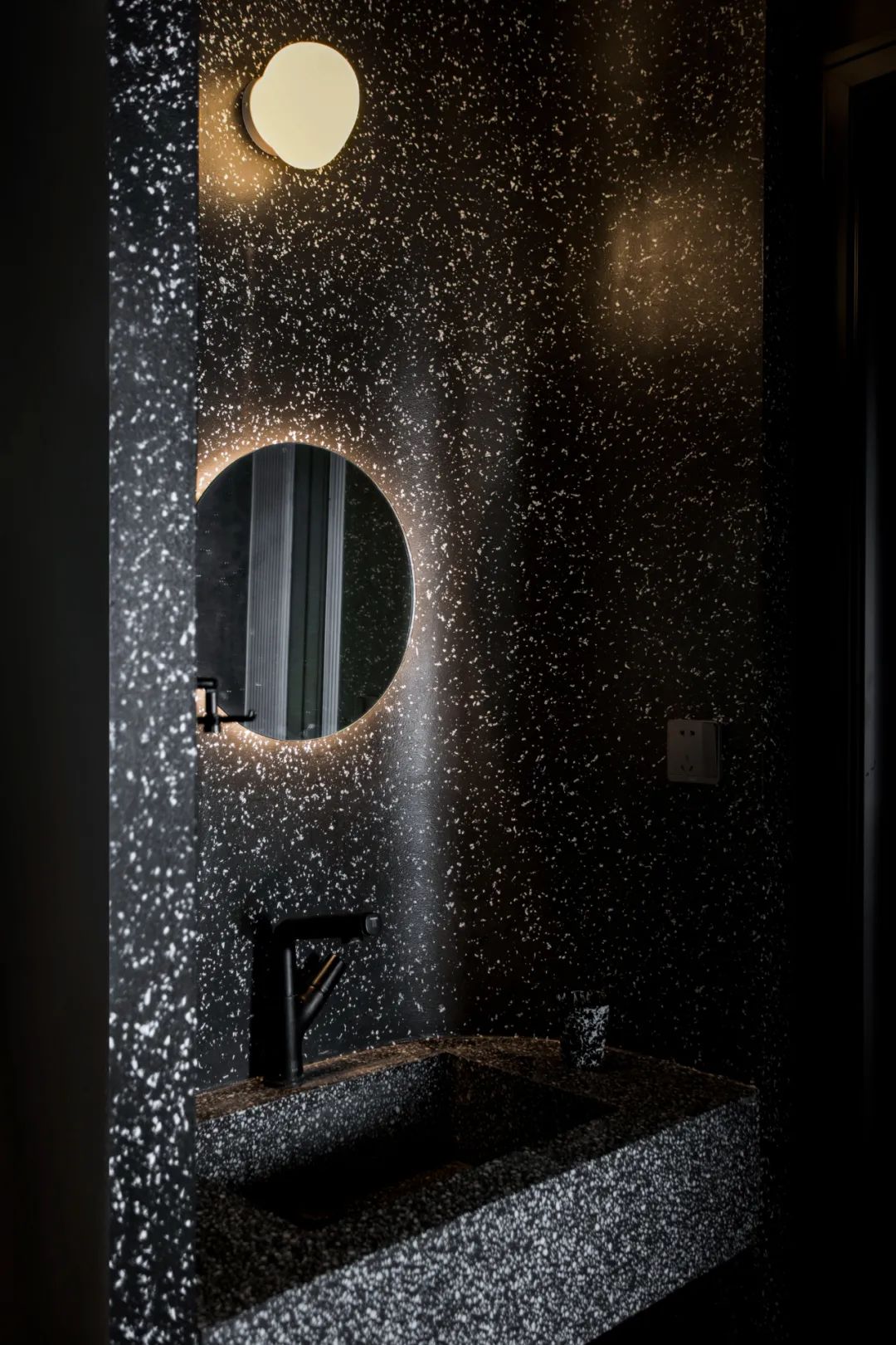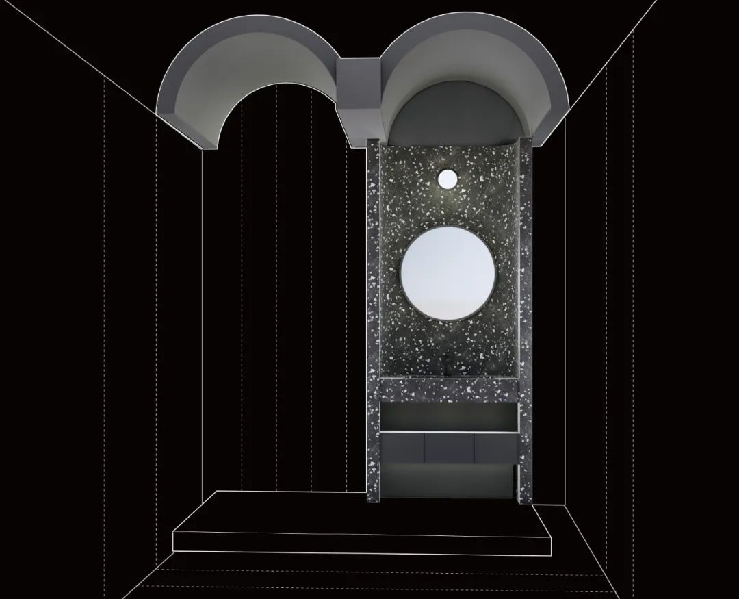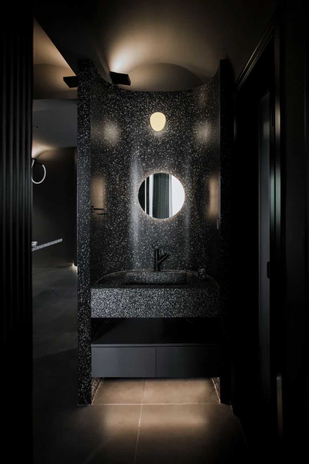 连拱空间使走道和洗手区成为了一个整体,质感漆墙面和石英石台面浑然一体,镜子背后映射出柔和的黄色灯光。圆弧拱顶设计是整个空间的符号象征。
