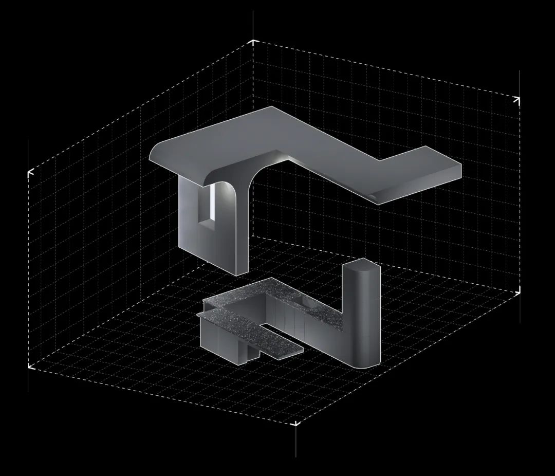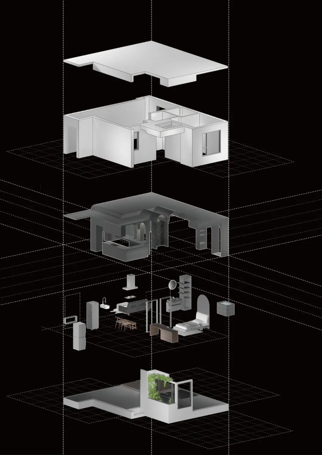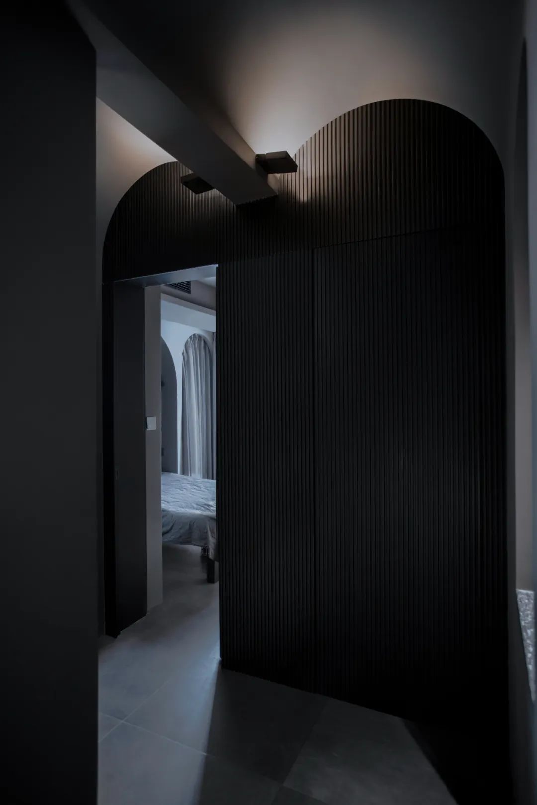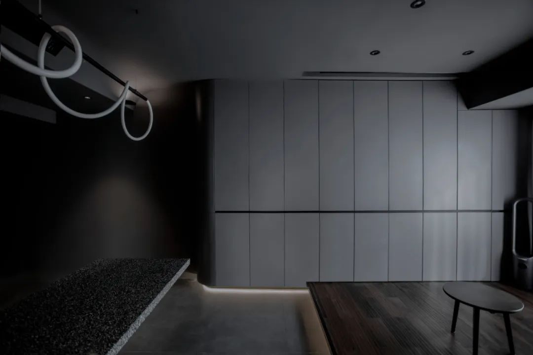 圆弧状的拱门和映射的暖黄色灯光与冷色系的灰色墙面,在室内充斥着这样强烈对比的表达。生活就是带给我们这种同样矛盾又能共处的长期情绪,因为生活的舒适感并不是单一放大一种情绪的快感而是在天秤的另一侧添加调味剂,而砝码的重量却依旧是自己本身控制。
