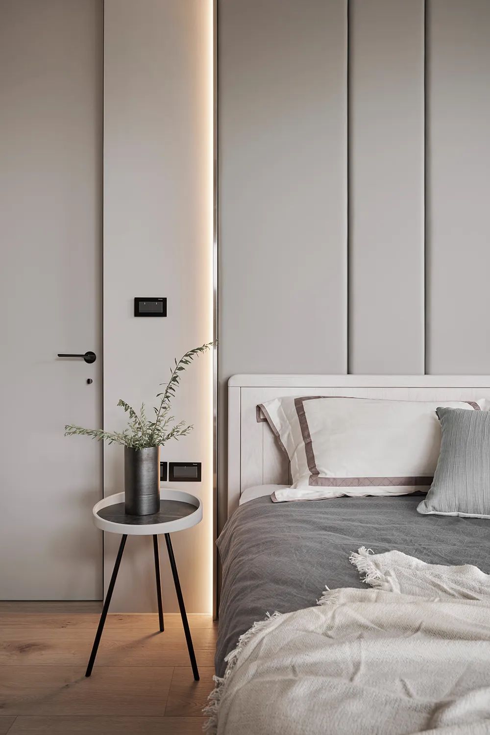 床头区以素雅的灰系绷布铺设
