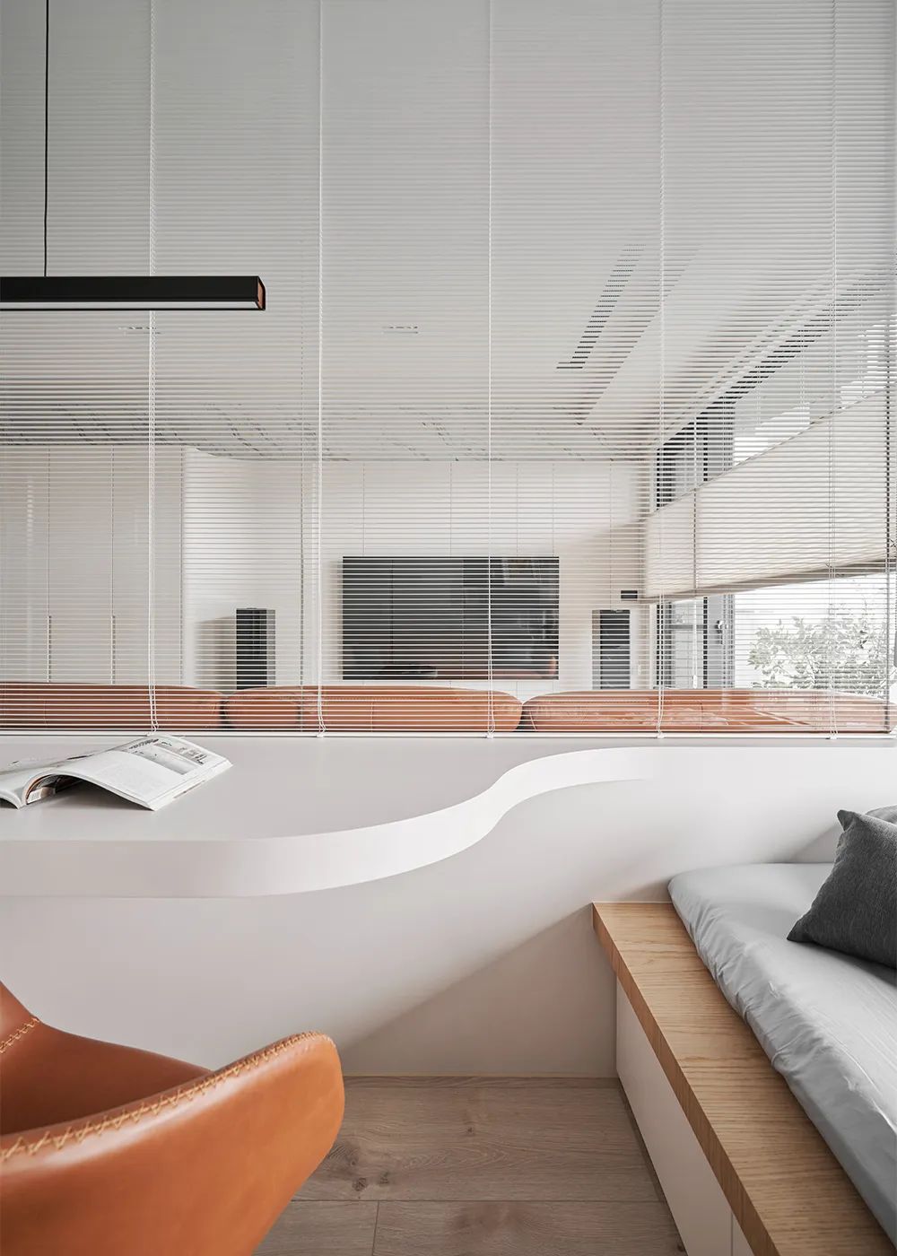 并善用优雅弧曲线型衔接书桌及卧榻区
