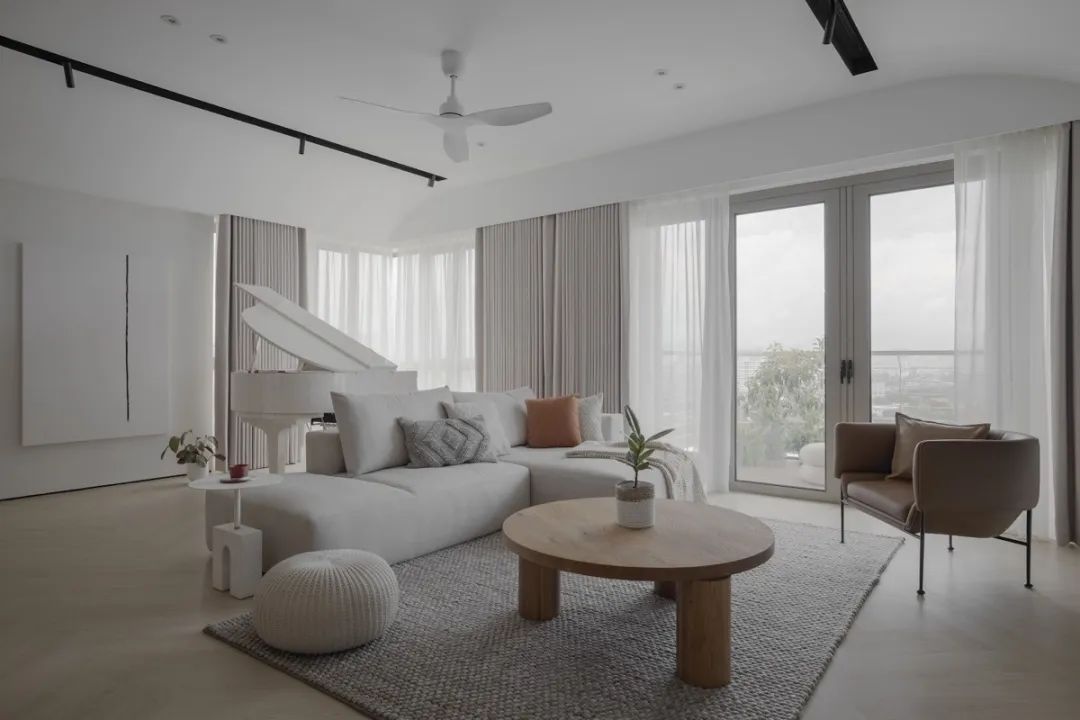 一个令人惊叹的白色三角钢琴被安置在空间的后面