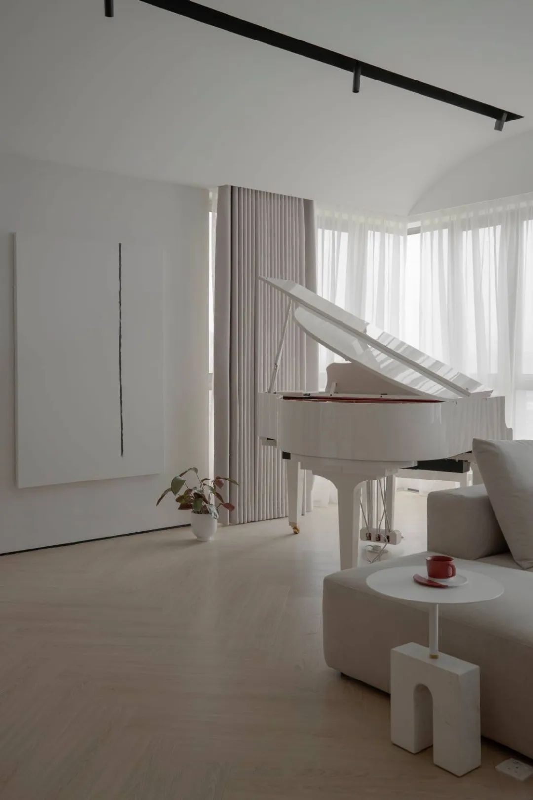 极简主义艺术和落地花盆为钢琴室提供安静的装饰