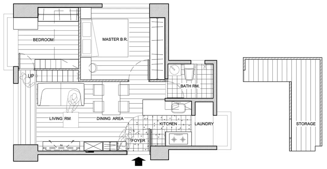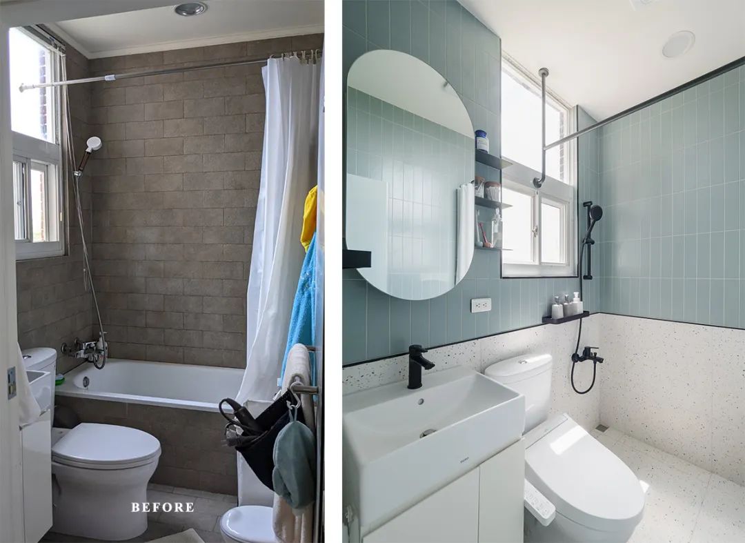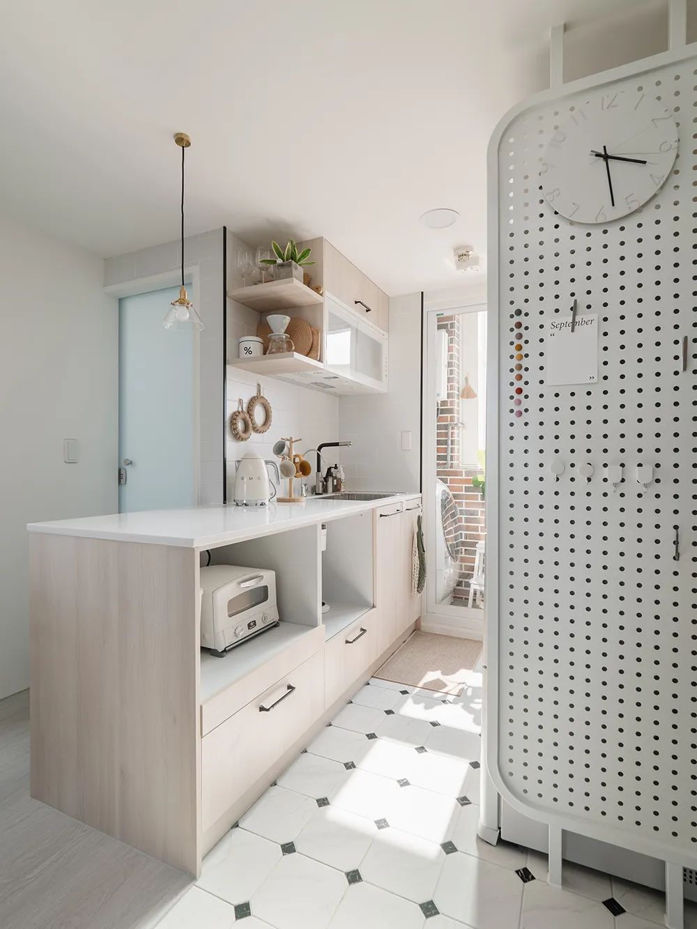 花砖相续摊开L 形地板,利用其止滑能力适应料理区景况,更重新编排了过去紧凑的烹调动线,藉由移动冰箱、电器柜,加长了流理台面,让女屋主得以好好发挥烹饪实力;这也因此增加了能双向使用的中岛台面,予以孩子一同参与料理的机会。