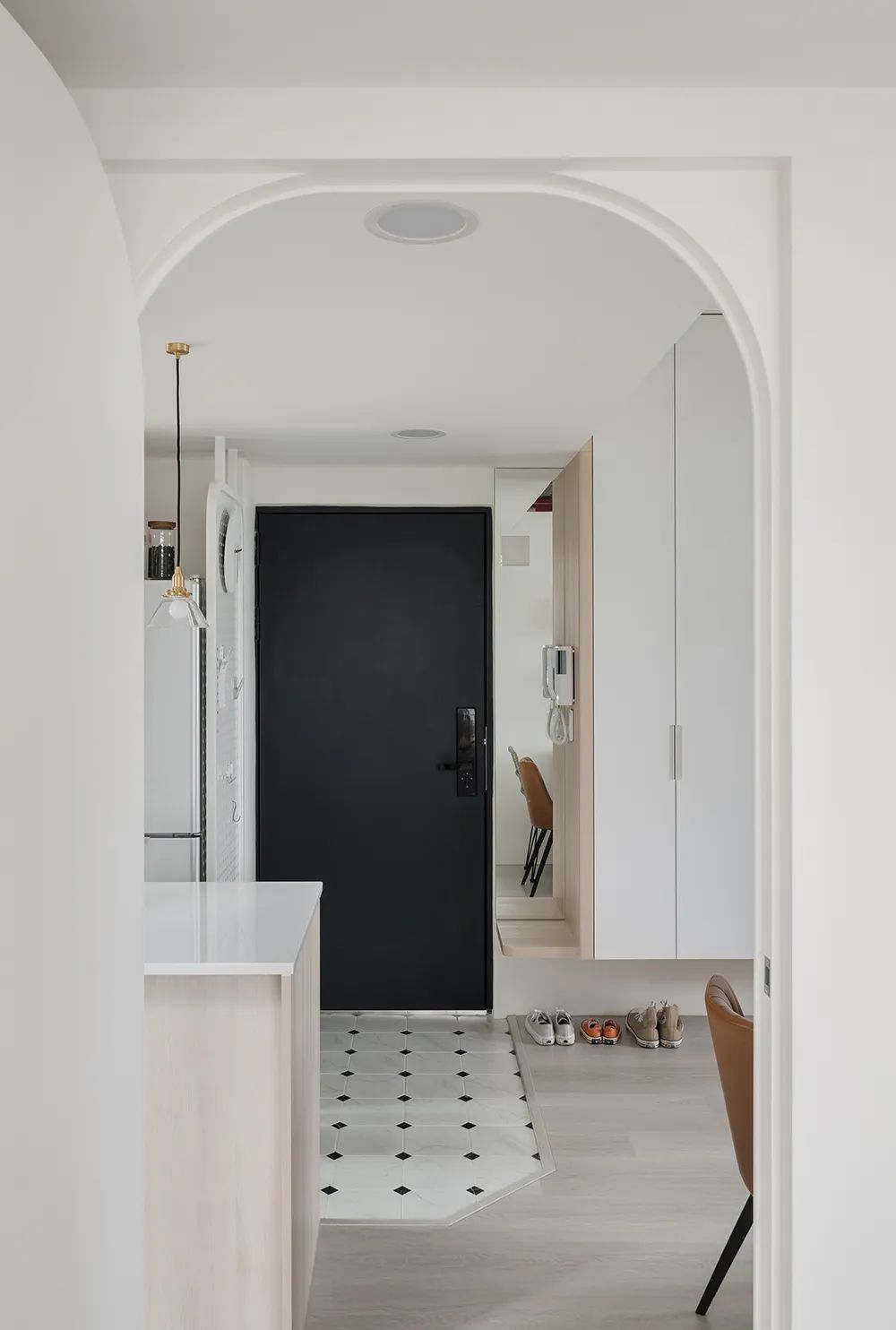 大门一侧则巧用鞋柜深度拉开穿鞋椅