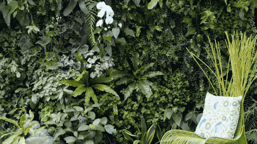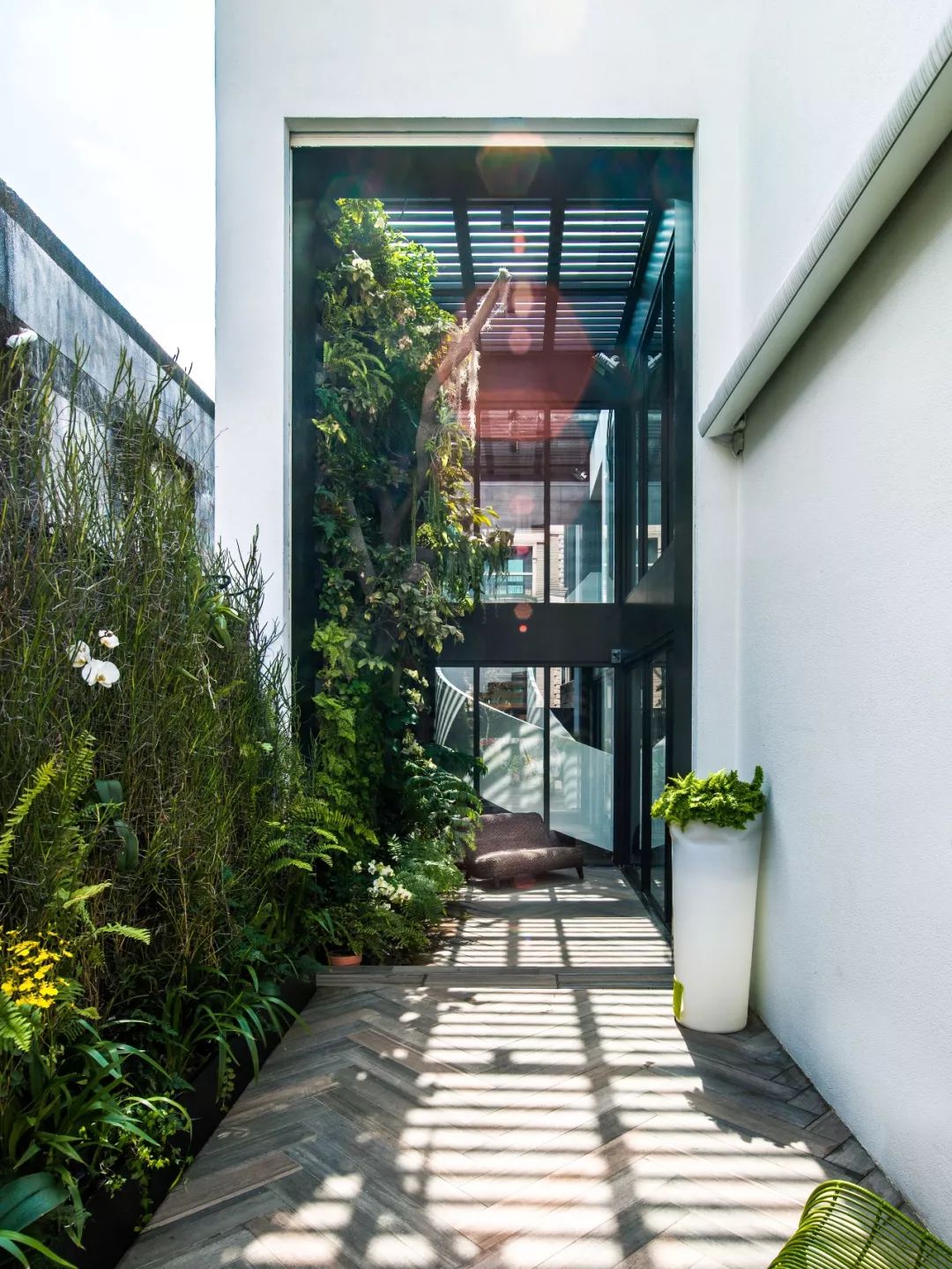 入口是一条长廊,往右转是一大面植生墙,6公尺的高度延伸两层楼,依照植物的特性去做排列,上面的是比较喜欢日照的植物,下面就是耐阴、潮湿的植物,随着它们的特性做垂直的变化,营造森林般的景观。
