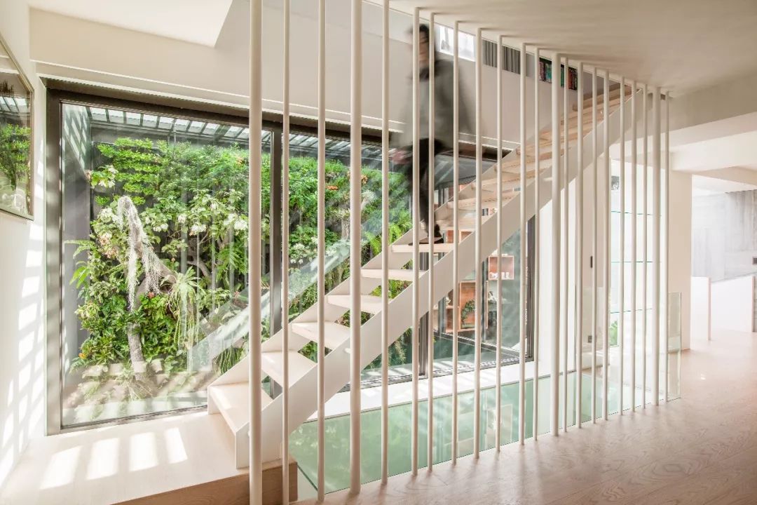 房子本身有50年历史了,以前是封闭的独栋式住宅,改建后我们用大面积的玻璃引进采光,让房子里充满光影变化,同时在不同楼层规划露台和绿植景观,让房子整体像被绿色包围。