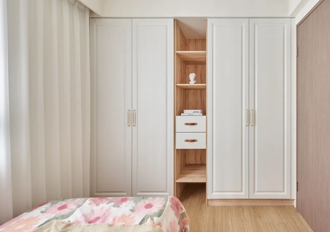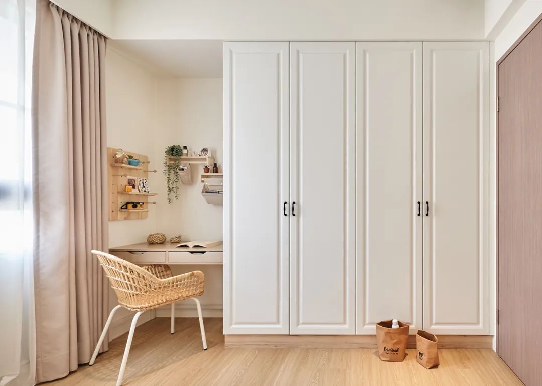 1. 玄关设计: 配有吊挂木杆以便置放返家后随身卸下的小物 离地45 公分处多加壁挂式折叠凳于下方 展现轻巧可收折的巧思 不占据落尘区空间也呼应整体风格色系 2. 客厅设计: 相偕倚墙靠背的布质沙发 电视主墙则铺叙木皮搭配几许直条切割线,注入活泼视感 设计师原先是依照梁下宽度划分收纳柜 但再三检视后发现这样会使电视墙占比过长、柜体显得小器 遂增加最外侧吊柜,让柜体与电视墙两者达到和谐比例 完美展示主人多年来视为宝贝的公仔收藏 屋主夫妻最喜爱的临窗卧榻处 采用活动式边桌+下轨道的模式 可随心调整位置 在此闲适喝杯咖啡、坐看高楼层独有风景 不用的时候可推至墙边收起,与转折处的储物木箱完整收合 3. 餐厨设计: 以便腾出宽敞的走道,并仔细考量与冰箱能够契合的宽度 避免多余的线条干扰,打造清爽简净的厨区领地 依照屋主一家人的生活习惯 中岛内加设客制化的电器抽盘 摆放电锅、微波炉等电器 以及餐纸巾等餐厨小物 台面则是男主人冲泡咖啡的地方 种种巧思解决了原先所担心厨房收纳不足的缺点 挑选高度与中岛可符合的木纹桌 藉由零距离的流畅动线,建立家人间亲密的互动性 围绕着中岛发生的趣事调味,让家更有味道 重新配置插座,便于笔电使用 必要时可兼作疫情时代下复合式的居家办公场所 4. 主卧设计: 作为墙面与衣柜门片的空间 洋溢美派的乡村感与精致细节 搭以润泽质韵的木地板 蕴生一方柔软舒眠的私领域 悄悄掺入的钮扣型把手与金属吊灯 让卧房氛围更显精巧 顺梁而下的直立柜,同属奶油白色 充满暖意的白与木质元素,两者相得益彰 也呼应延续公区的气质,这份拿捏恰当的温雅 不过于甜腻也非冷艳 与此同时,设计师利用转角处 巧妙置入特殊烤漆处理过的黑系铁件吊杆,增添耐磨度 5. 姐姐房设计: 窗边柔软的波浪状纱帘轻轻摆动 运用乡村门板订制的系统柜,兼具美观与实用 宽敞的储纳条件足够置放冬夏藏衣与配件 抓好适当间距,中央处设以空柜型式搭配皮革质材 好让居者灵活运用,可作为展示纪念小物或是摆放衣物 6. 妹妹房设计: 加装于门片的把手改采用带有个性感的爵士黑 配上圆弧椅背的藤椅,流露朴净清简的质雅风范