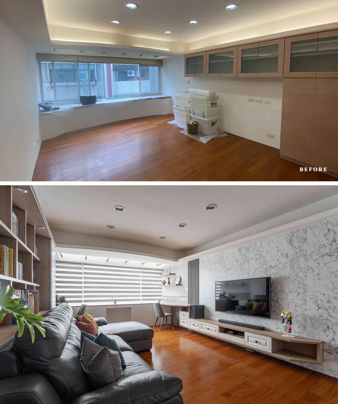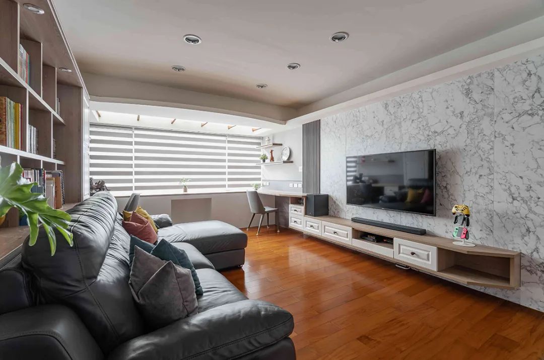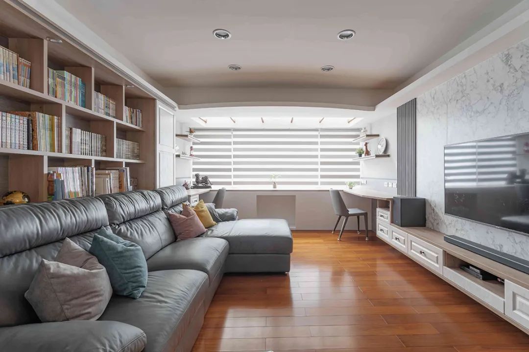 沿用原木地板,砌一整道开放式书墙为沙发背景