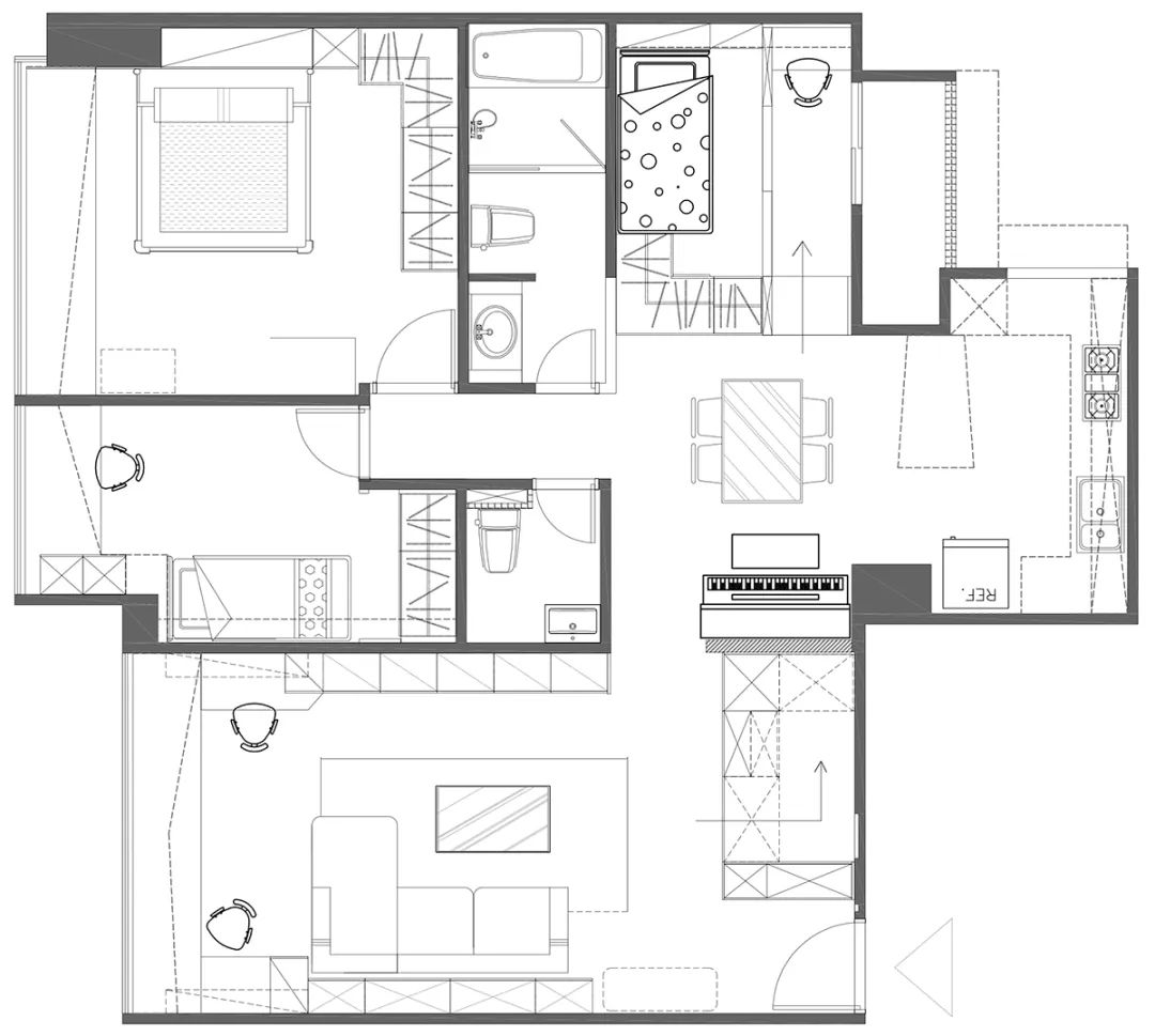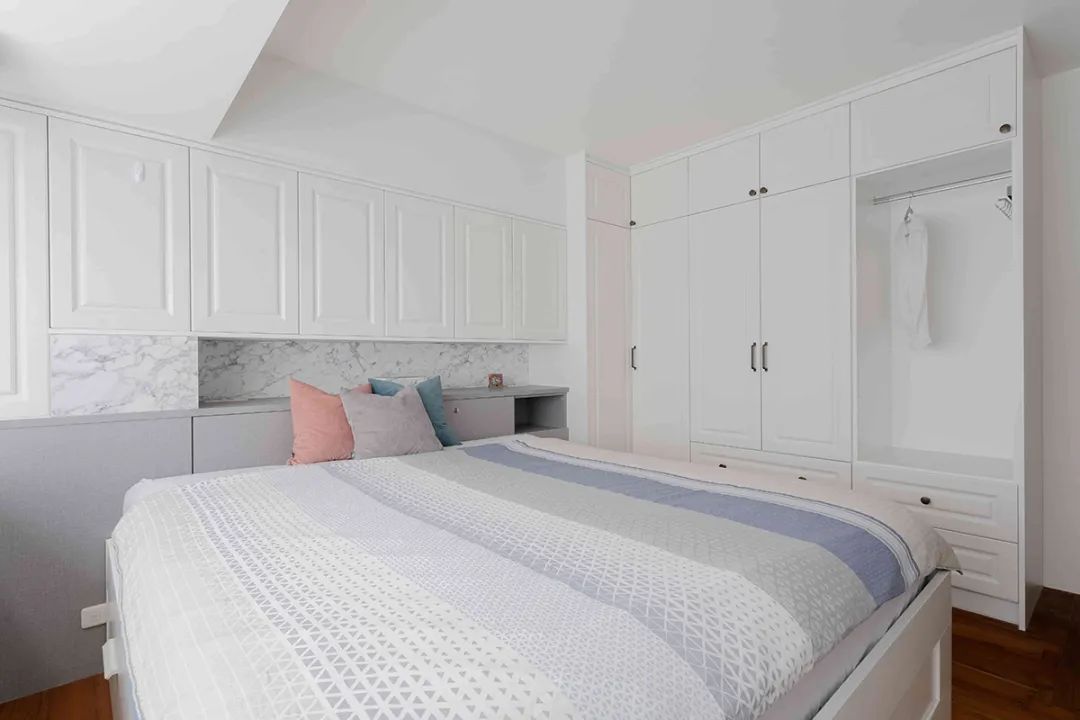 从床侧至床头上柜,皆砌筑层柜以满足四季收纳