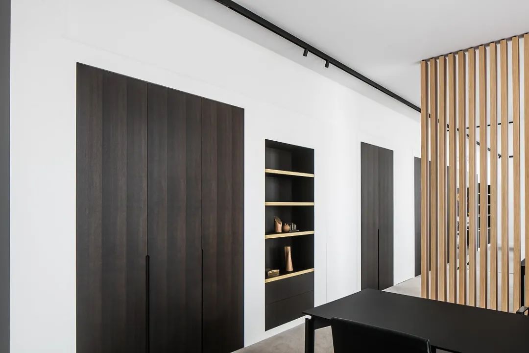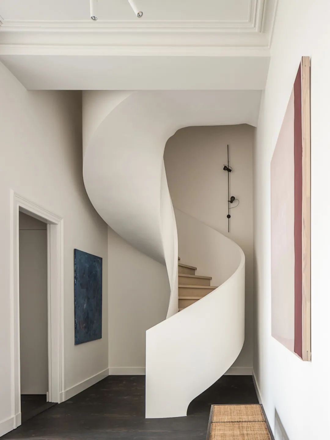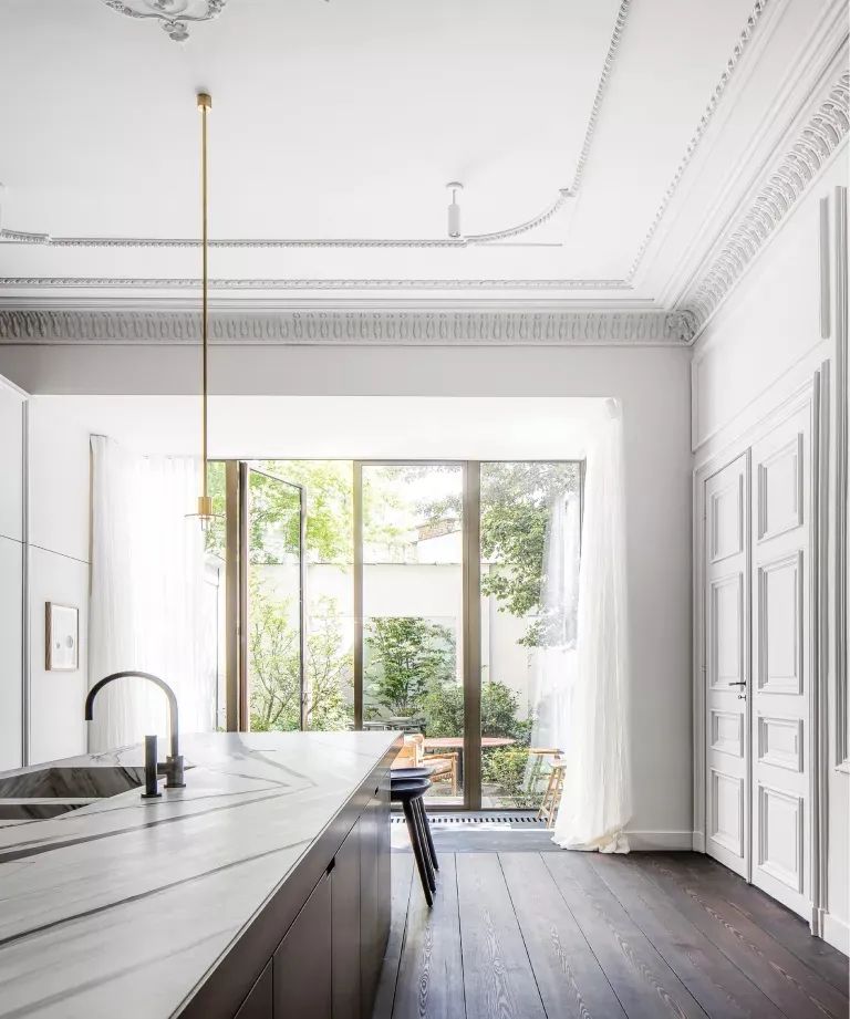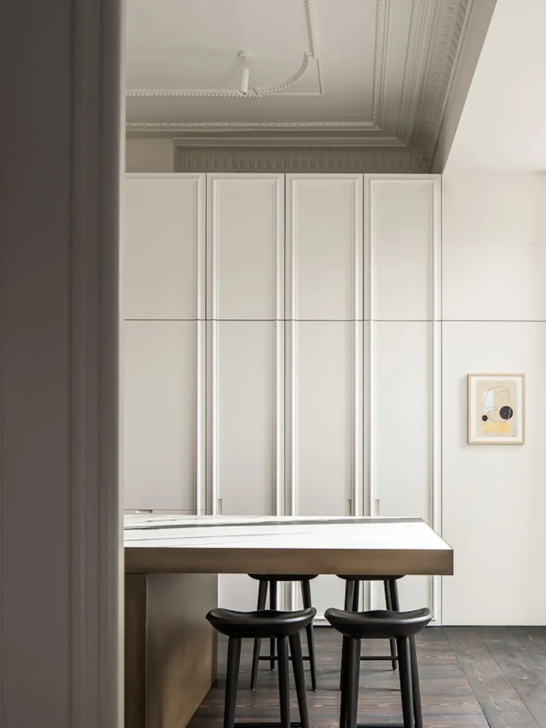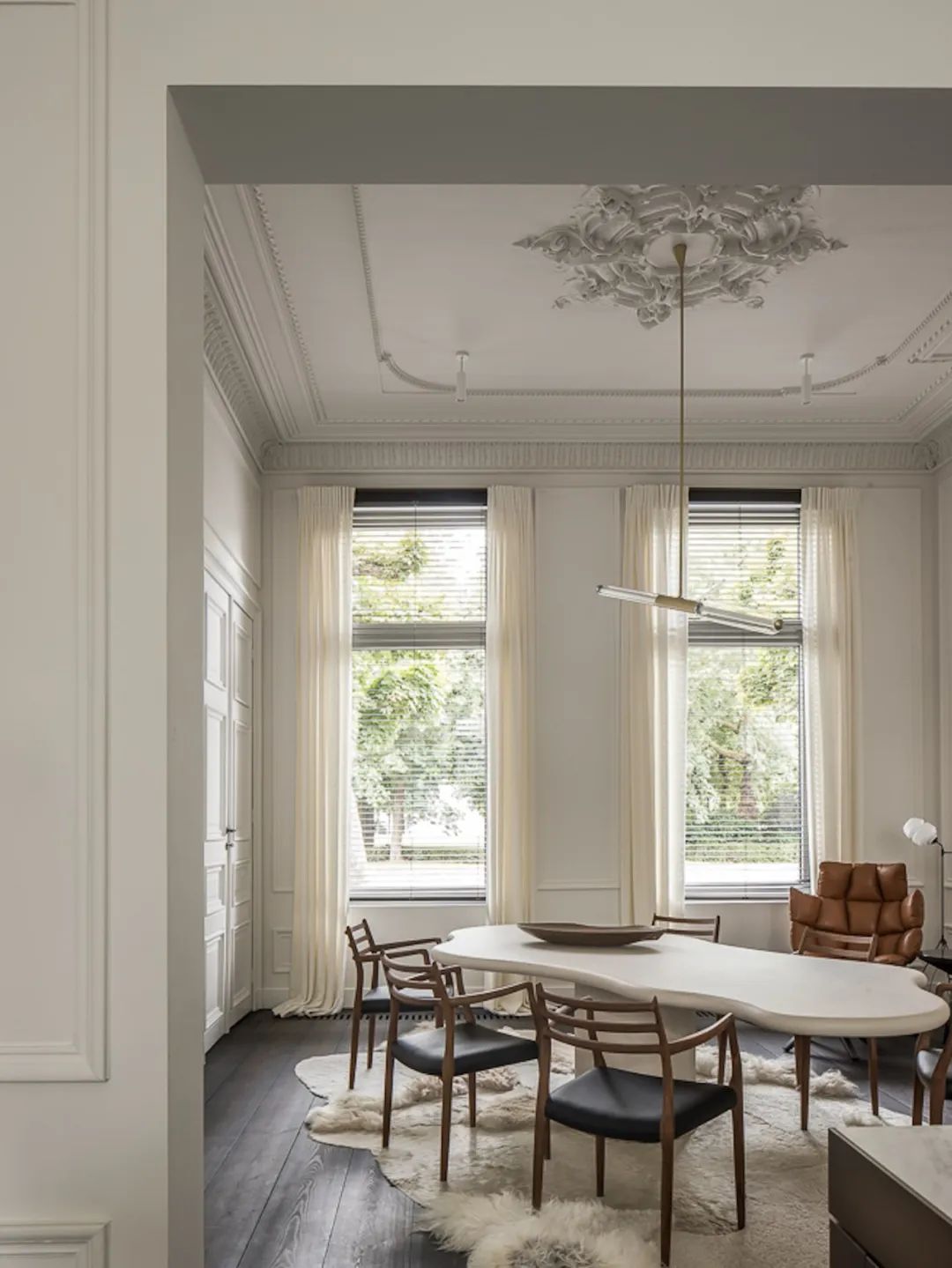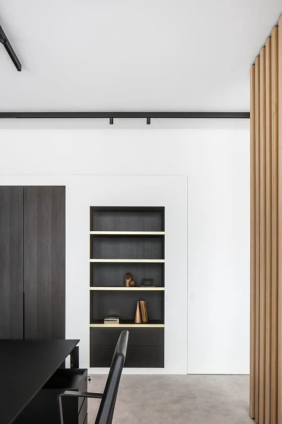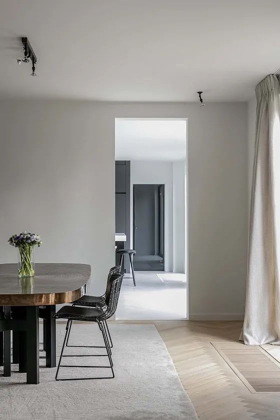 “家庭需要安静,而这所房子的宁静与精致会让所有人都最让我们印象深刻的。”一位颇具审美的室内设计师是怎样理解自己的家呢?比利时设计师Evelyn Moreels回答了这个问题。她将其视作一间“避难所”。在比利时西北部港口城市根特(Ghent)的市中心,一座新古典主义的联排别墅将现代设计与时代细节完美融合,凝聚出一束对抗城市喧嚣的光芒。他的花园被高墙包围,窗户安装了厚厚的玻璃,隔绝外部声音,这就像生活在一个茧里。Evelyn Moreels和建筑师Pascal Bilquin一直保持着默契的合作。所有的设计和布局由Evelyn Moreels完成,而室内的对称性和光线问题则交给了Pascal这位天赋建筑师。这座别墅经过改造后,延续了原有的庄重和平静,变化的日光给人一种空灵的感觉。晚上,灯光落在前立面上,随着夜幕降临,气氛变得更加神秘。平和与宁静是这所住宅的精神,也是室内调色板的来源。高高的天花板、原始的地板和楼梯,Evelyn不知何故想起了巴黎,但她希望添加现代的元素进入。Evelyn觉得白色是大多数房间里最适配的颜色,因为它像一张白纸,可以让设计师画出心中的造型。当然空间也有黑色元素,但仅限于书房和一些家具和灯具。 如火焰环绕的布局,锐利而具有感染力。在时代细节中为当代家具赋予了现代主义背景。橱柜上的珠饰延续了餐厅的镶板,营造出空间与空间之间的凝聚力。白色的墙壁则将原始造型拉到焦点上,并使艺术品发挥最大优势。餐桌的非传统形状适用于整个家庭,但它也为Evelyn夫妇提供了更亲密和舒适的环境。在炉灶旁喝酒。在餐桌上欣赏公园上空的日落景色,那是一种轻松舒适的体验。卧室的现代性首先通过浅中性色调表达出来,白桦木橱柜、海草配饰相得益彰,营造出如酒店客房般的豪华和平静氛围。 花园感觉就像是市中心的一片绿洲。在设计花园景观方面,Evelyn Moreels特地邀请了Aldrik Heirman来进行设计。策略性地种植已成熟的灌木,以软化建筑的轮廓并创造更多空间的错觉。“在阳光明媚的日子里,在庭院花园的有盖露台下,你真的可以想象自己已经被运送到了伊维萨岛(Ibiza)上。”这栋属于Evelyn Moreels的“避难所”在城市中成为一个珍贵的“茧地”,隔绝所有纷杂与喳闹。“简约并不是用少来表示少,而是用少来表示多。一个醇熟的极简风格的设计师应当通过最简单的设计,表现最舒适和效果最佳的空间。”Evelyn Moreels设计的Kantoren Aedimar是一个非常规的办公场所,雪白的色调、精致的装饰、舒适的软装,使其兼具了现代生活的舒适优雅和办公空间的功能需求。雪白的空间也有明暗的感觉,不过不是自然光影,更多的是用黑白色彩的拼接对比,黑色材料使用原生的木材,在白色石膏墙上有“纪律”地穿插,像钢琴键一样,构成现代时尚的基本格调。头脑风暴的中心在会议室,它被放置在一个充满光线的地方,所有的激情与灵感交汇于此。