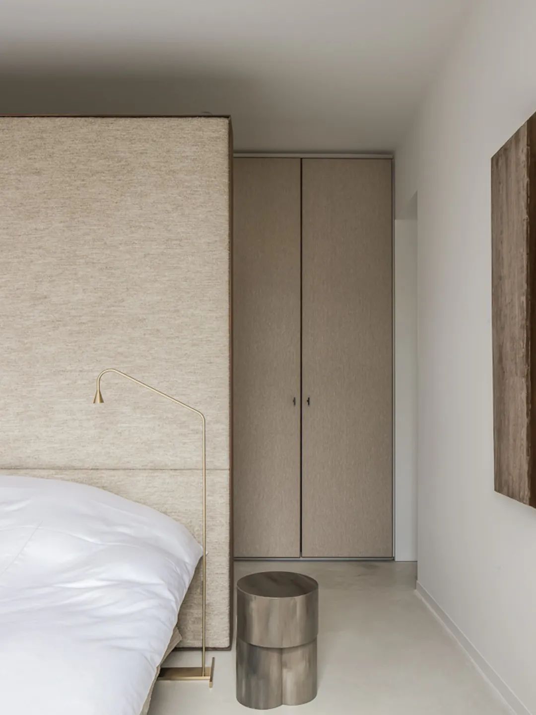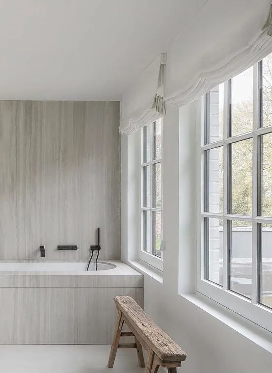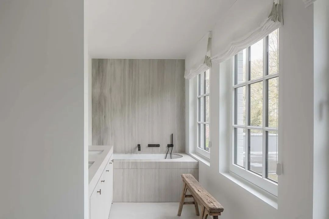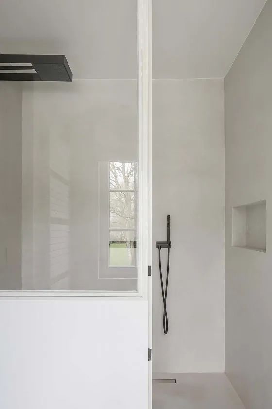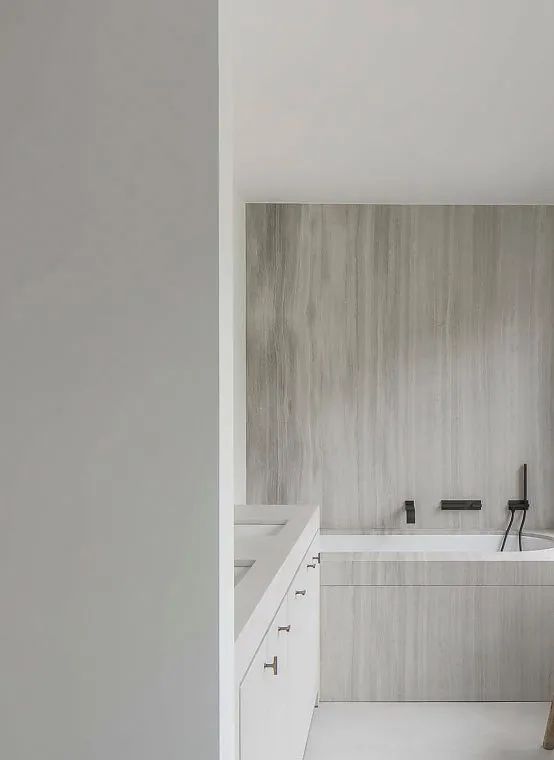 “极简主义生活其实是更加注重自我和内心的舒适,像是追求自我,对最真实的自己进行探索。”Privewoning住宅给人的感觉仿佛是一幅新古典主义的世界名画,萦绕于心。白色的调色板,混合多种设计与情感,表现出居住者丰富的内心世界。一幅优秀的画作需要合理利用“留白”,很显然Evelyn Moreels做到了这一点。冲压石灰墙与黄铜五金的搭配带来轻工业风的复古情怀,主要框架自依然是简洁的白色石膏墙,窗户面向室外,带来充沛的自然光线,使得室内充满诗意。亚麻一向是日系简约生活的主要内容之一,鼠灰棕色是综合了室内调色板的结果,它细密却又松软的材质正好容纳了光线,使之疏离而自然。浴室的布局与风格和阳台十分相似,只是那种复古的氛围被替换成了轻快的现代风格。轻盈的量感与日光产生化学反应,使其在静态中展现出生活最真挚又最平静的那一面。Evelyn Moreels深谙静态之美,住宅本是吞吐生活动态的载体,在这位设计师的铸造下,变身为一幅安静的画作,呈现最真实的静态之美。