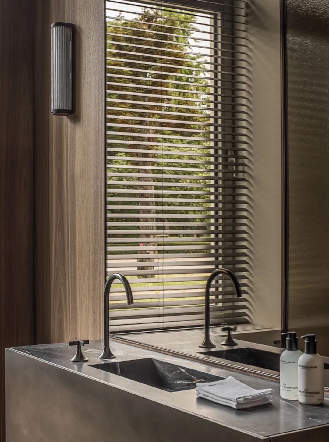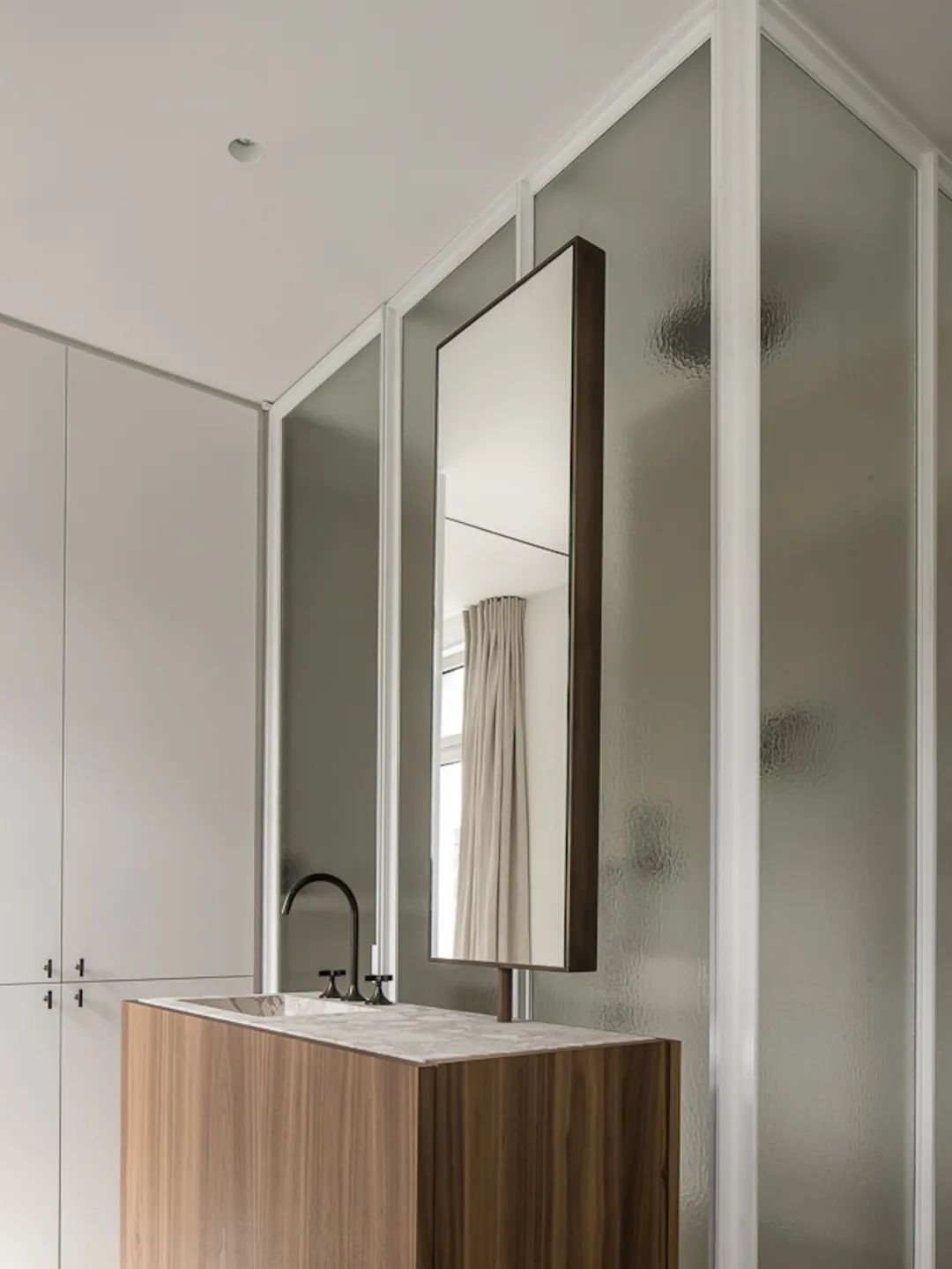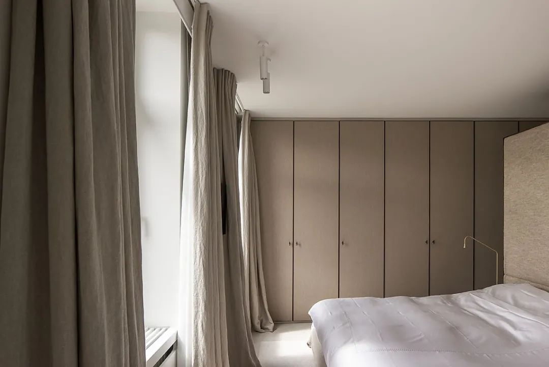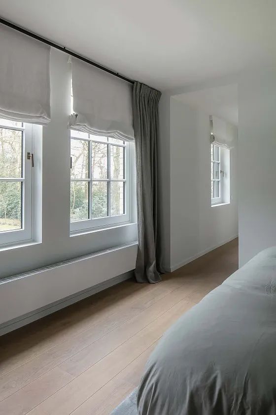 “极简主义生活其实是更加注重自我和内心的舒适,像是追求自我,对最真实的自己进行探索。”Privewoning住宅给人的感觉仿佛是一幅新古典主义的世界名画,萦绕于心。白色的调色板,混合多种设计与情感,表现出居住者丰富的内心世界。一幅优秀的画作需要合理利用“留白”,很显然Evelyn Moreels做到了这一点。冲压石灰墙与黄铜五金的搭配带来轻工业风的复古情怀,主要框架自依然是简洁的白色石膏墙,窗户面向室外,带来充沛的自然光线,使得室内充满诗意。亚麻一向是日系简约生活的主要内容之一,鼠灰棕色是综合了室内调色板的结果,它细密却又松软的材质正好容纳了光线,使之疏离而自然。浴室的布局与风格和阳台十分相似,只是那种复古的氛围被替换成了轻快的现代风格。轻盈的量感与日光产生化学反应,使其在静态中展现出生活最真挚又最平静的那一面。Evelyn Moreels深谙静态之美,住宅本是吞吐生活动态的载体,在这位设计师的铸造下,变身为一幅安静的画作,呈现最真实的静态之美。