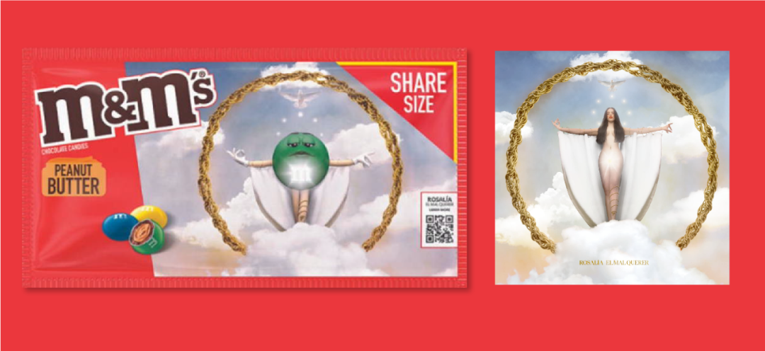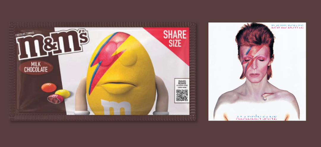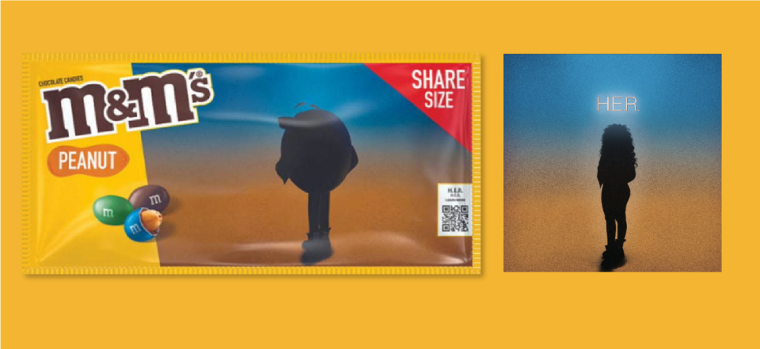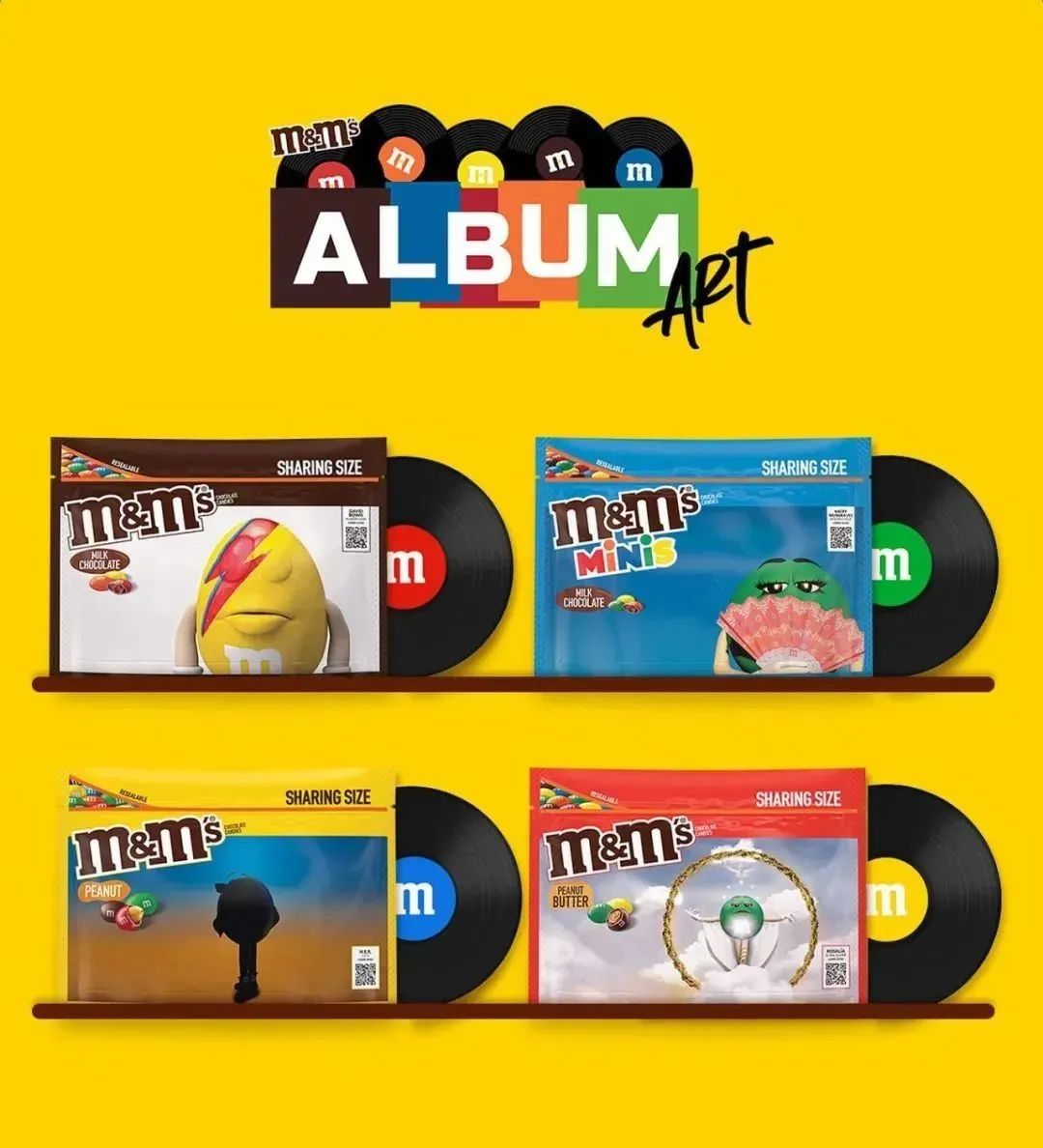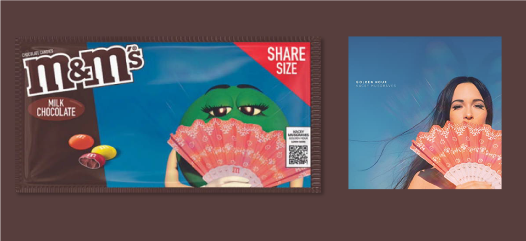 麦当劳的广告把金拱门标志玩出了花样,熟悉的LOGO可以出现在任何意想不到的地方,无处不可的麦当劳就是要超越你的想象。M&M巧克力豆公司今年最新推出四款限量版的专辑艺术包装,COSPLAY四个经典或流行歌手的唱片专辑封面。黄色M豆代表英国歌手David Bowie的 专辑「Aladdin Sane」,脸上画着歌手标志性的闪电状红色油彩;以纸扇掩面的绿色M豆是重现美国乡村歌手Kacey Musgraves的「Golden Hour」专辑造型。绿色M豆披着白色斗篷升上云端的灵感来自西班牙歌手Rosalía的专辑「El Mal Querer」;花生味的包装上只有一个黑色的神秘M豆剪影,是美国歌手H.E.R的首张同名专辑的封面设计。M&M巧克力豆公司把IP的力量发挥到极致,几十年间,这六个大号的M豆已经成为全球最有辨识度的形象之一。