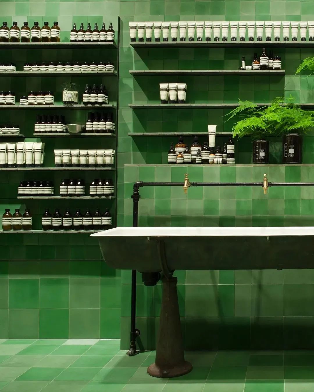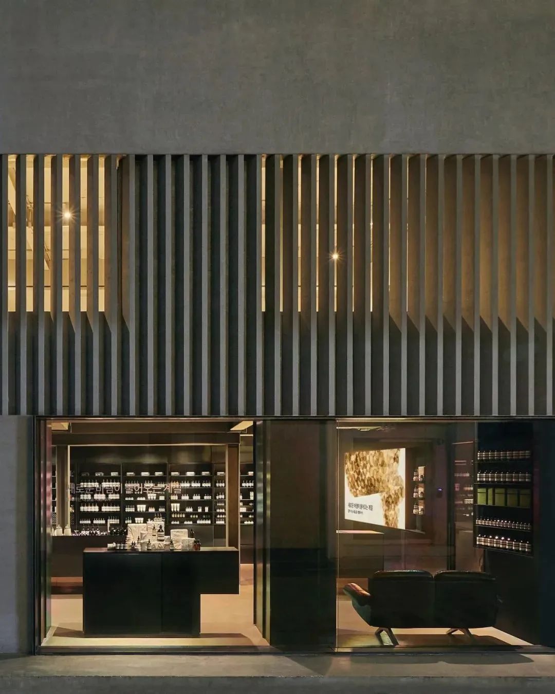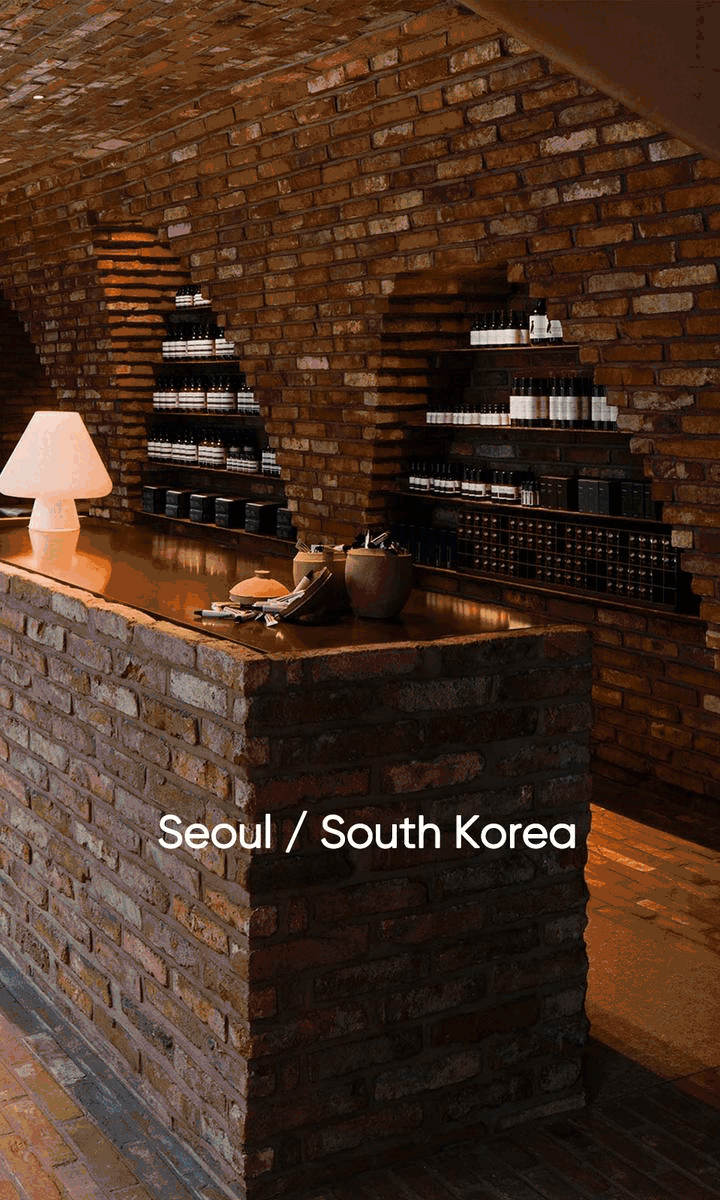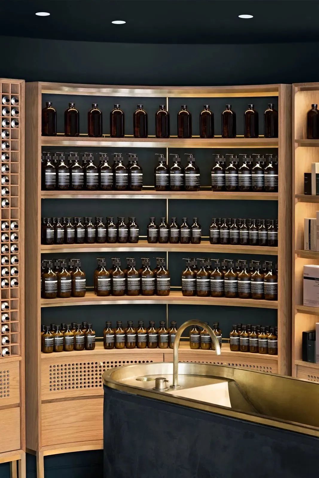 Aesop门店坐落于蒙特利尔著名的爵士乐街区Petite-Bourgogne,这里汇聚众多经典的老牌爵士俱乐部。为了更好地融入爵士乐文化,设计师采用低调的深墨色绒面皮革为主配以黄铜金属与浅色橡木,打造爵士俱乐部的复古质感。Aesop在韩国首尔开设了9家门店,即使在同一个城市,落在每一个街区开设的门店风格也各有千秋。正如创始人Dennis Paphitis曾在采访中所说:Aesop并不想为门店选择一个橙或绿那样的标准色,而是融入城市的街道,以当地的设计语言表达品牌想做的事。不过,Aesop在全球门店内都会设置一个洗手池,旁边摆放着各种可供试用的产品,确保顾客随手选取产品试用。而且,设计师在Aesop的洗手池设计上也会花费心思,比如德国柏林门店用的是一个20世纪50年代的水槽,是设计师从一个当地老农场上回收的。