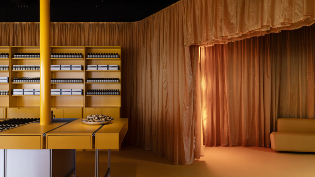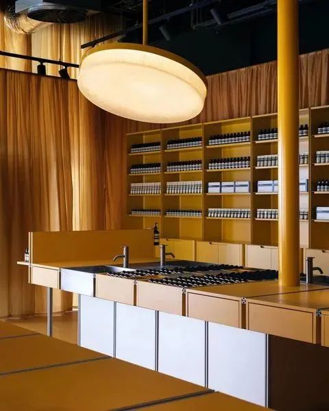 爱丁堡第二家Aesop的门店设计,以纯净的暖黄单色为主,店内挂满了橙黄色的织物,配以黄色展示柜和创意灯具,力求打造暖黄的氛围。这种高饱和度的暖橙色,灵感正是来自当地的荆豆花,这是一种全年都在盛开金黄色的花朵,开遍在爱丁堡的老火山(Arthur’s Seat)之上。