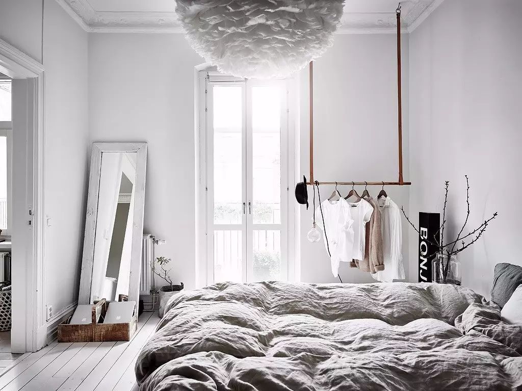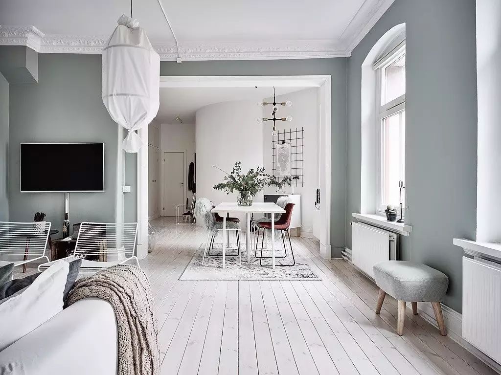温润的木质地板搭配灰色地毯白色墙面,整个空间都更为干净,营造出柔和安宁的的北欧空间。