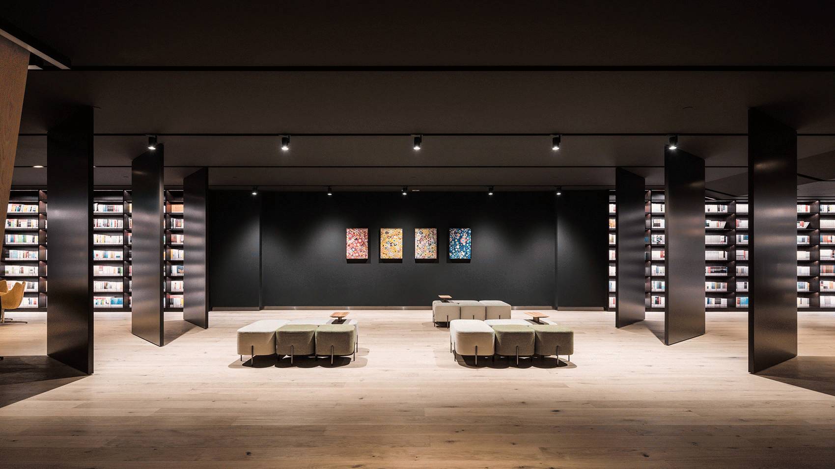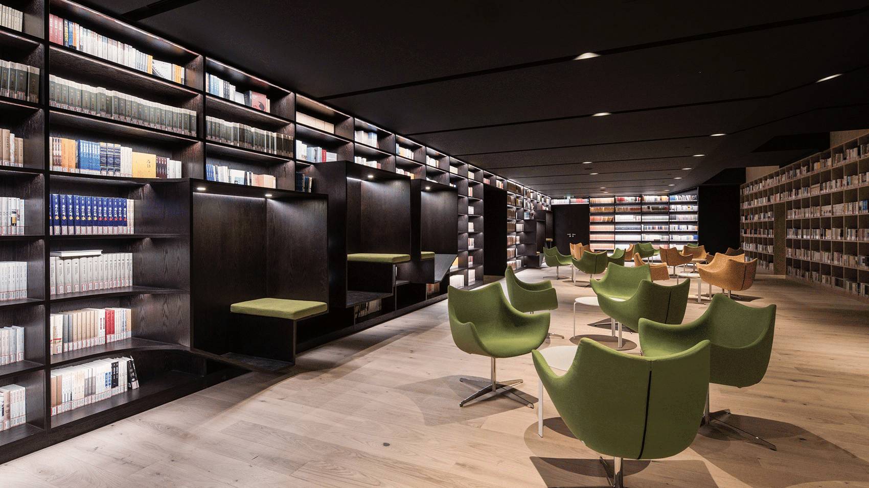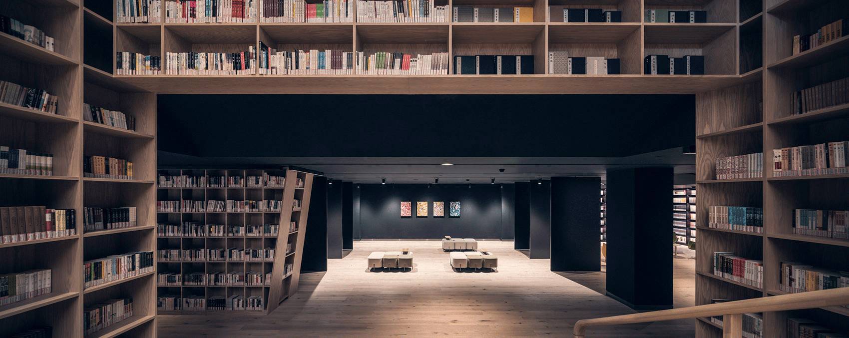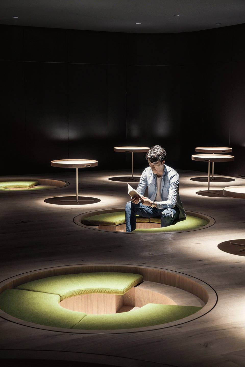 ▼ 下层黑色的阅览区和上层的木制空间形成对比