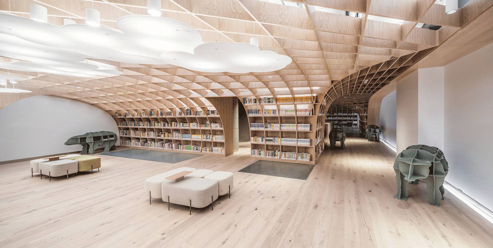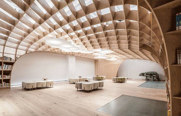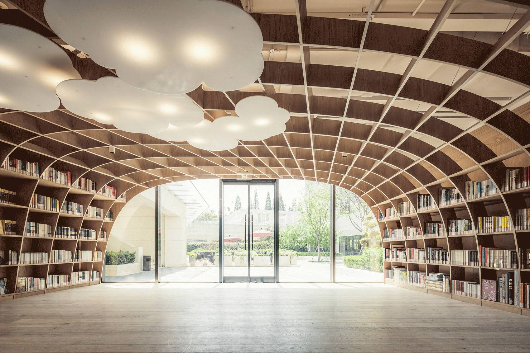 由于物质条件的丰裕,思想才更需要凸显其温暖人心的价值。建筑师就此创作的自由自在的阅读和艺术场所打动了业主。于是被委托重新设计这个已经完成施工图、并已开始施工的项目。在具体落实上,建筑师以最合理和最经济的方式介入设计修改,在不改变原有结构、分区、规范等设计基础的情况下,对整个空间氛围完成了脱胎换骨的改变。在入口层(上层),曲线的仿木铝板柔和地升起降落,云片状的吊灯蜿蜒穿越其中,仿佛庭院绿意被最大程度引入室内后,被提炼形成森林一般自由自在的空间感,社区居民可以在这里卸下面具而放松的交往,这似乎可以看见有如节日的欢快和愉悦。