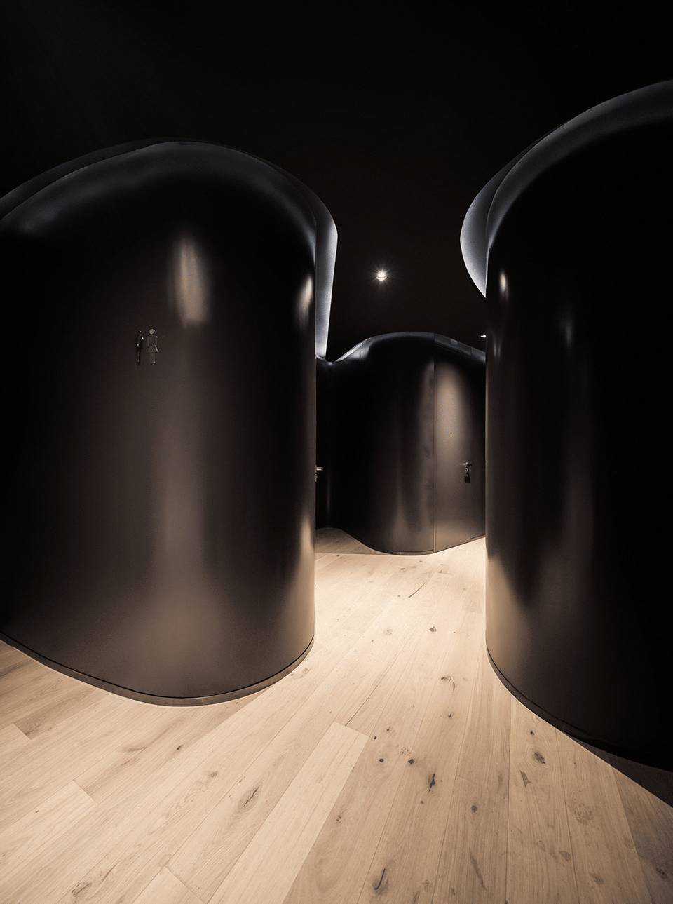 作为主角的大台阶使得上下两层成为一体,不仅是人流,光线也可随着大台阶从室外有如瀑布倾泻而下进入下层。这个下层是不同于上层,它是更沉静的对偶空间,在这里,交往的需求被降低,我们希望来访者更专注的阅读、以及欣赏艺术画作,这里需要沉下心,建筑师用大面积的黑色削弱了活跃度,并在两翼进一步用黑色和灯光营造更加私人化、冥想化的空间,包括洗手间。从而造就了整个社区里最有神秘意境的洗手间。最后这个邻里中心达到了建筑师的设想,自由交往和思考。