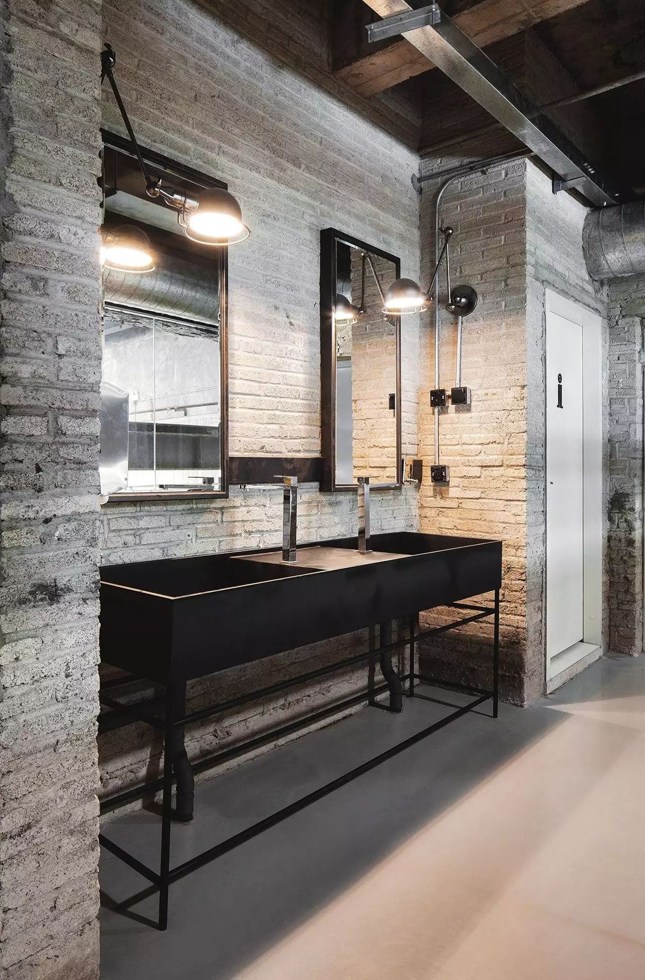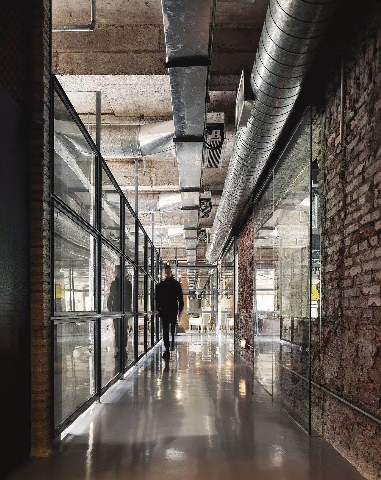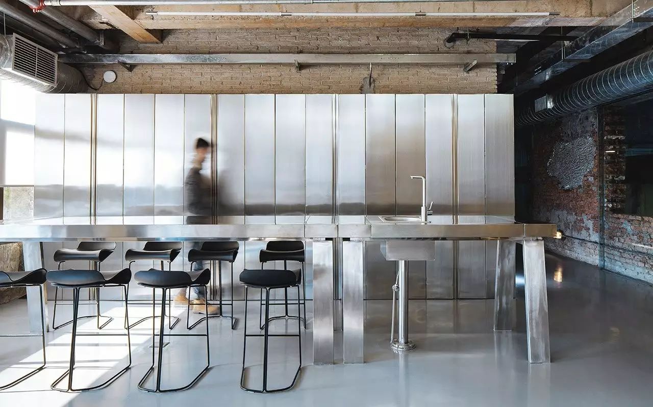 就装潢而言,建筑的原始的纹理建筑材料被突出显现,在露出的红砖墙和混凝土天花板以及沿着它们的管道和梁上看到的最前沿。同时,地板已被一个闪亮的浅灰色环氧树脂漆覆盖,给室内装饰带来了意想不到的微妙波兰。玻璃还具有突出特点,而不仅仅是露出的窗框指向,也可以作为走廊之间的分隔线,并铺设在墙壁上的“窗户”上,这样可以勾勒出建筑物其他部分(如入口区域)的视野。