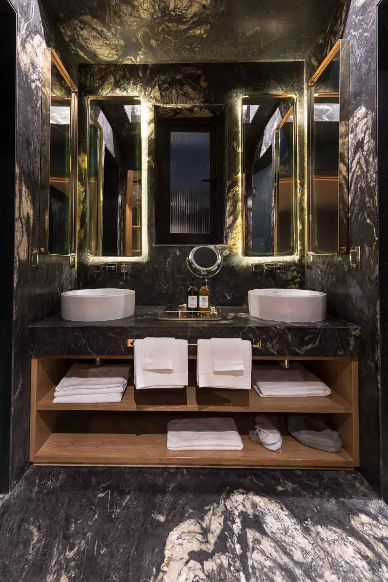 主卧室位于建筑中心,从风格到质感皆最为奢华,透过色调与灯光的配合,营造出优雅温厚的气息;其他四间套房环绕主卧,各自拥有搭配巧妙的配色与陈设。每个空间呈现风格一致但不失个性的室内设计,并拥有各自独立的卫浴,确保入住的旅客能够享有完全的安静与服务。