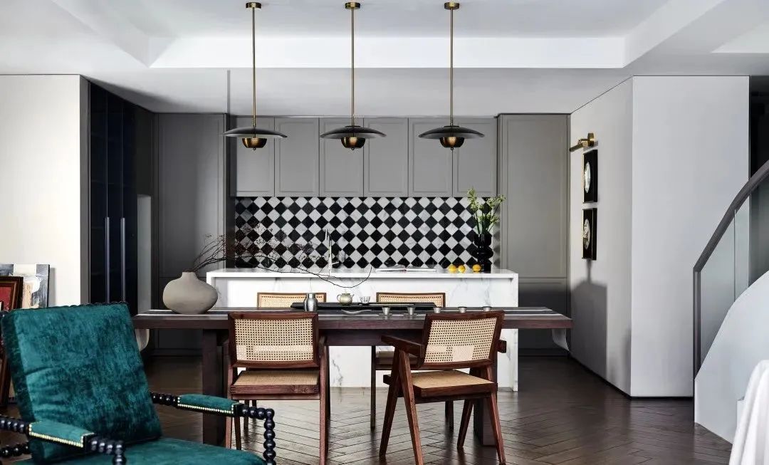 整体呈现出来的是一幅江南园林画的线稿,用青色来勾勒家具,现代与复古结合的家具更加耐看,还摆放了天鹅绒饰面的美式休闲椅,是在向上世纪五十年代的设计致敬。
