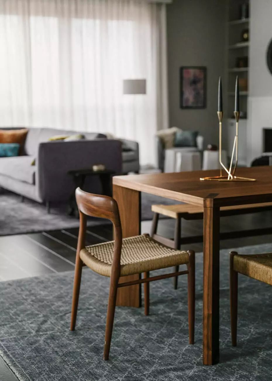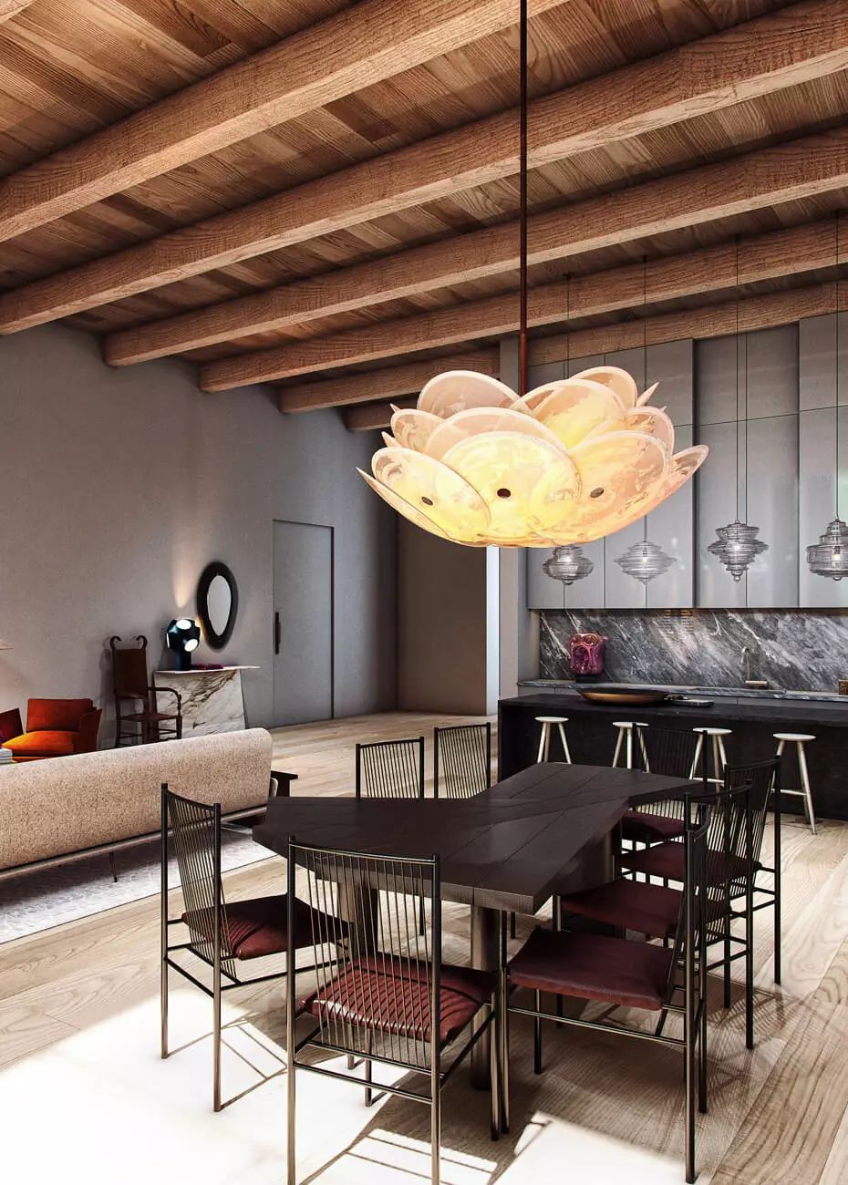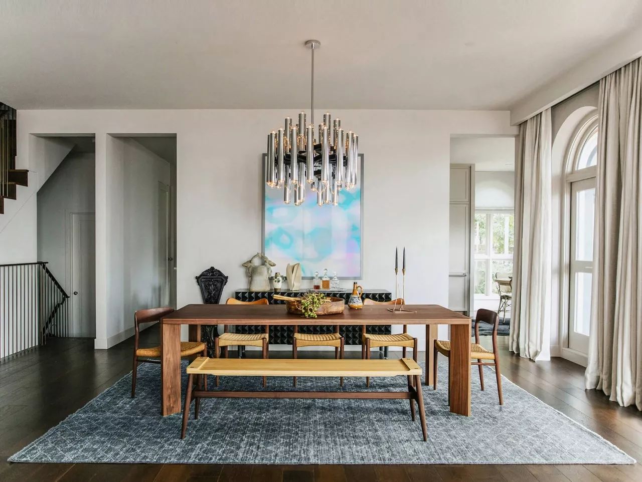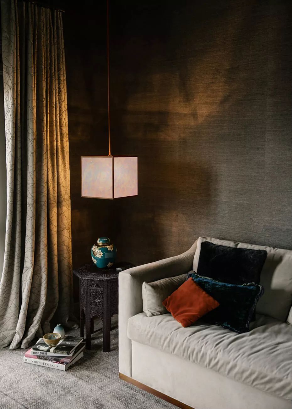 丝绸地毯和编织窗帘与宽阔的橡木地板深棕色调色板相得益彰。复古镀铬吊灯和质感灯具为娱乐空间增添了温暖的光芒。