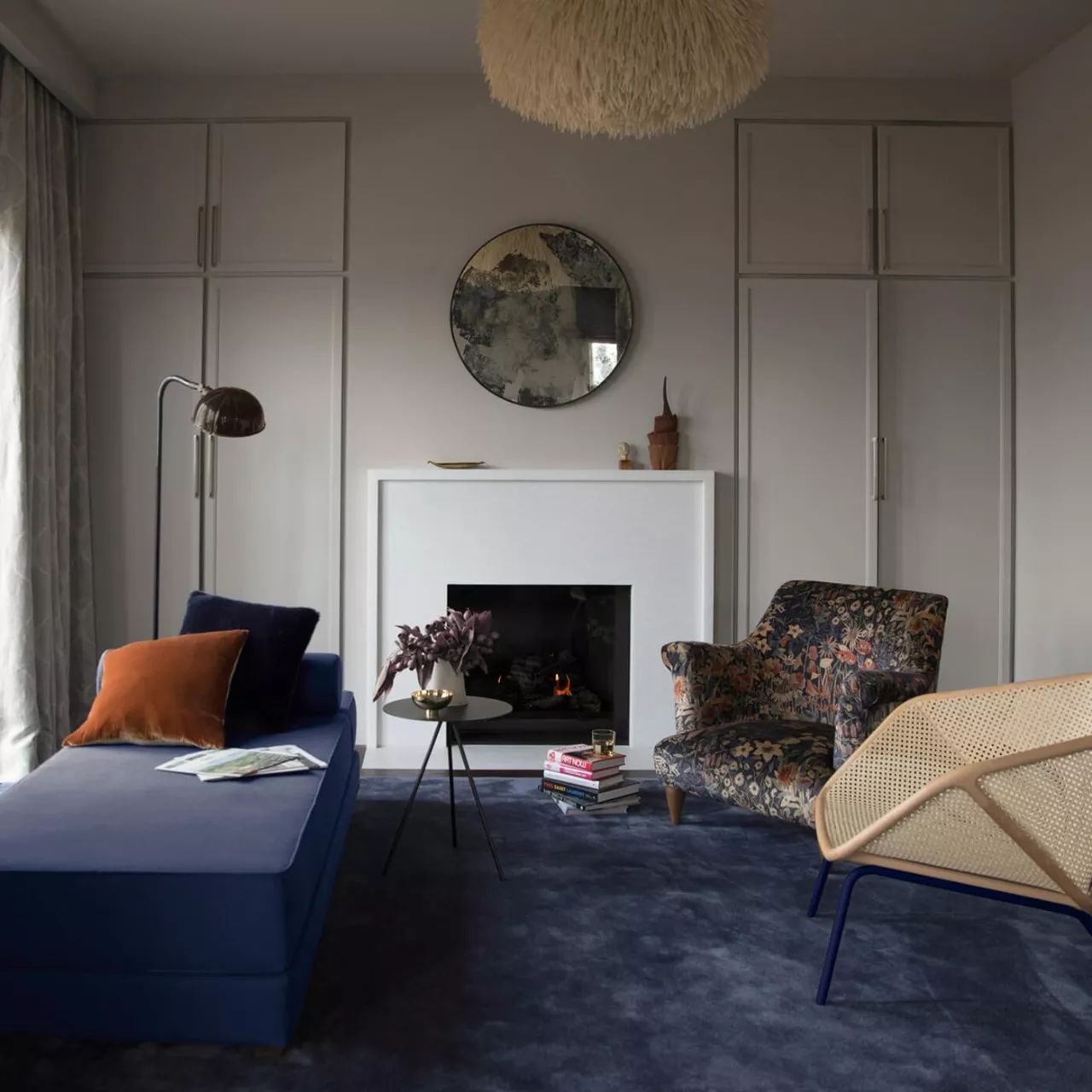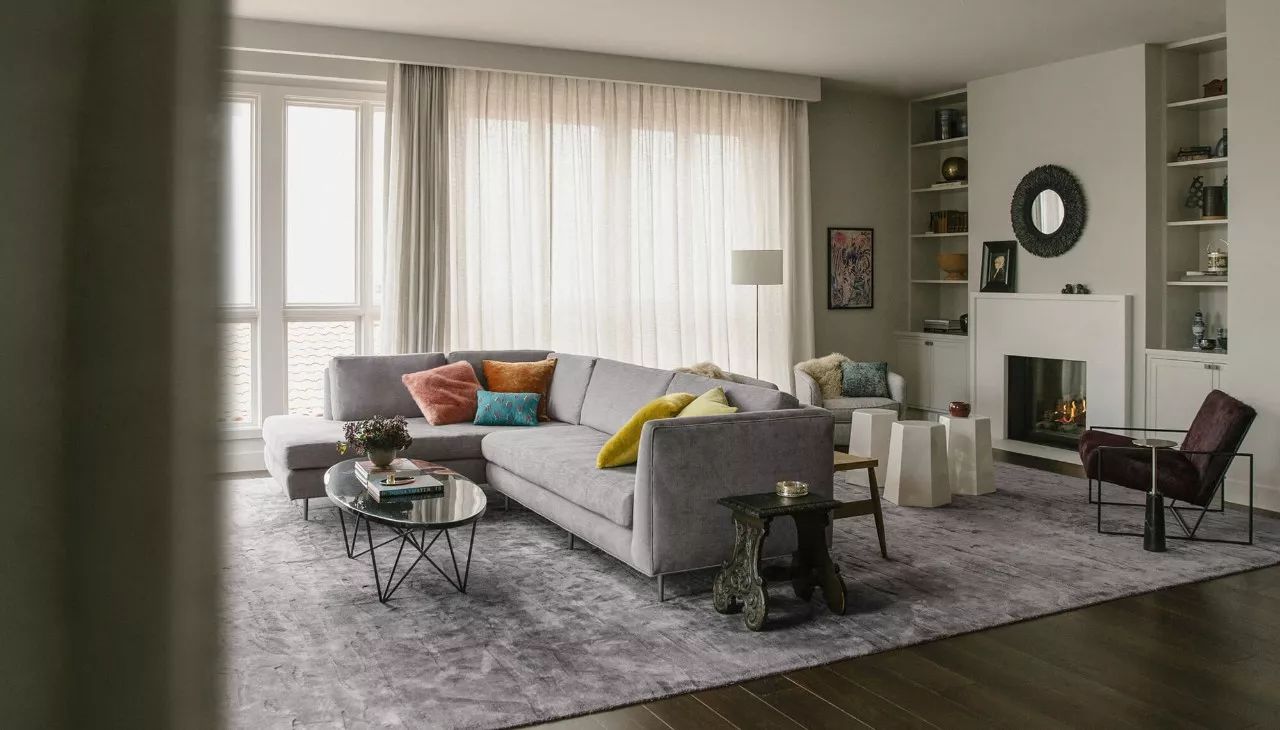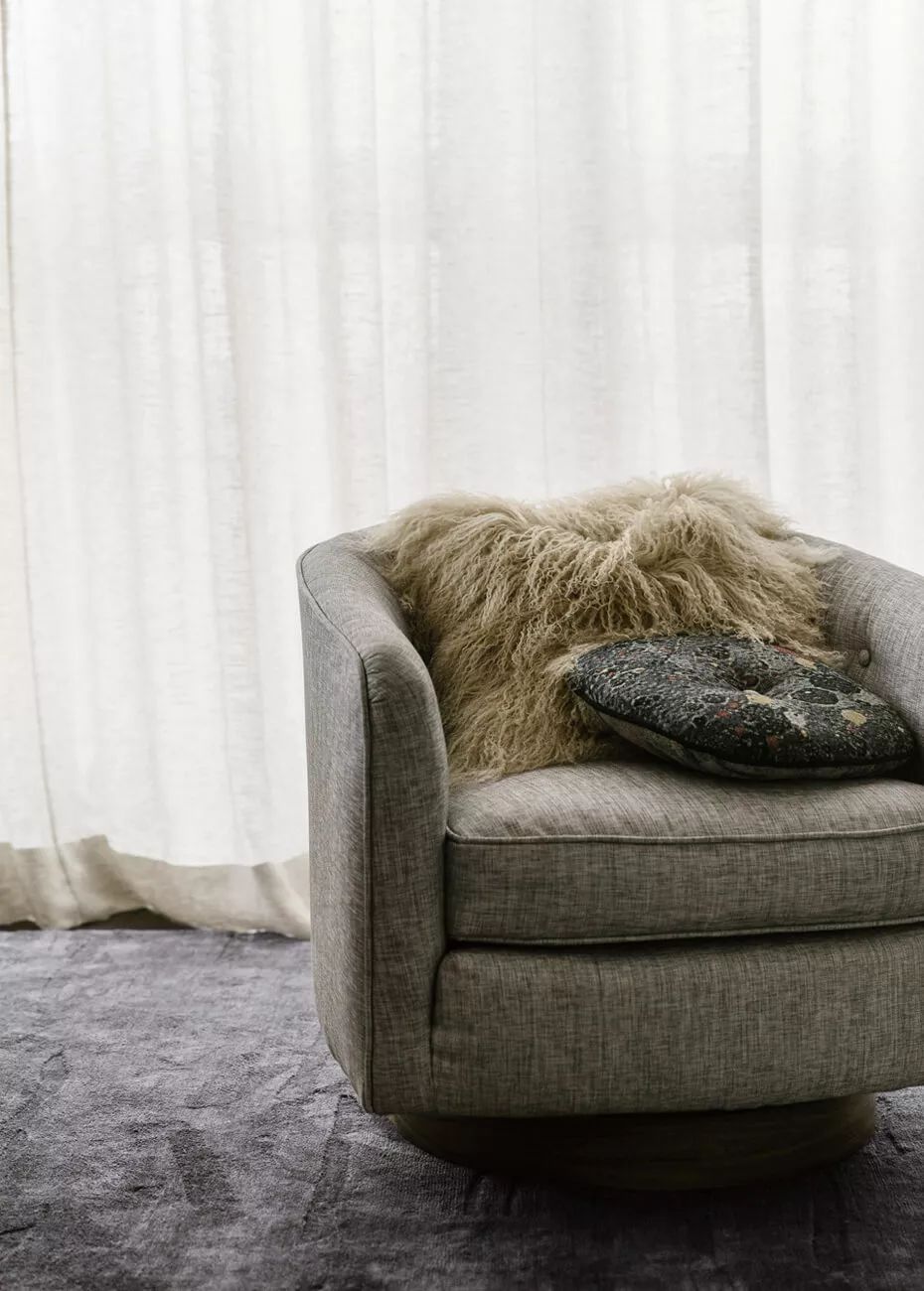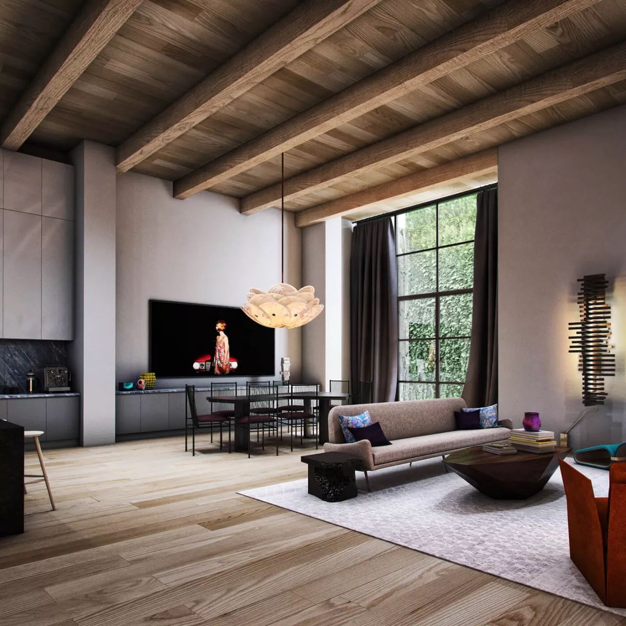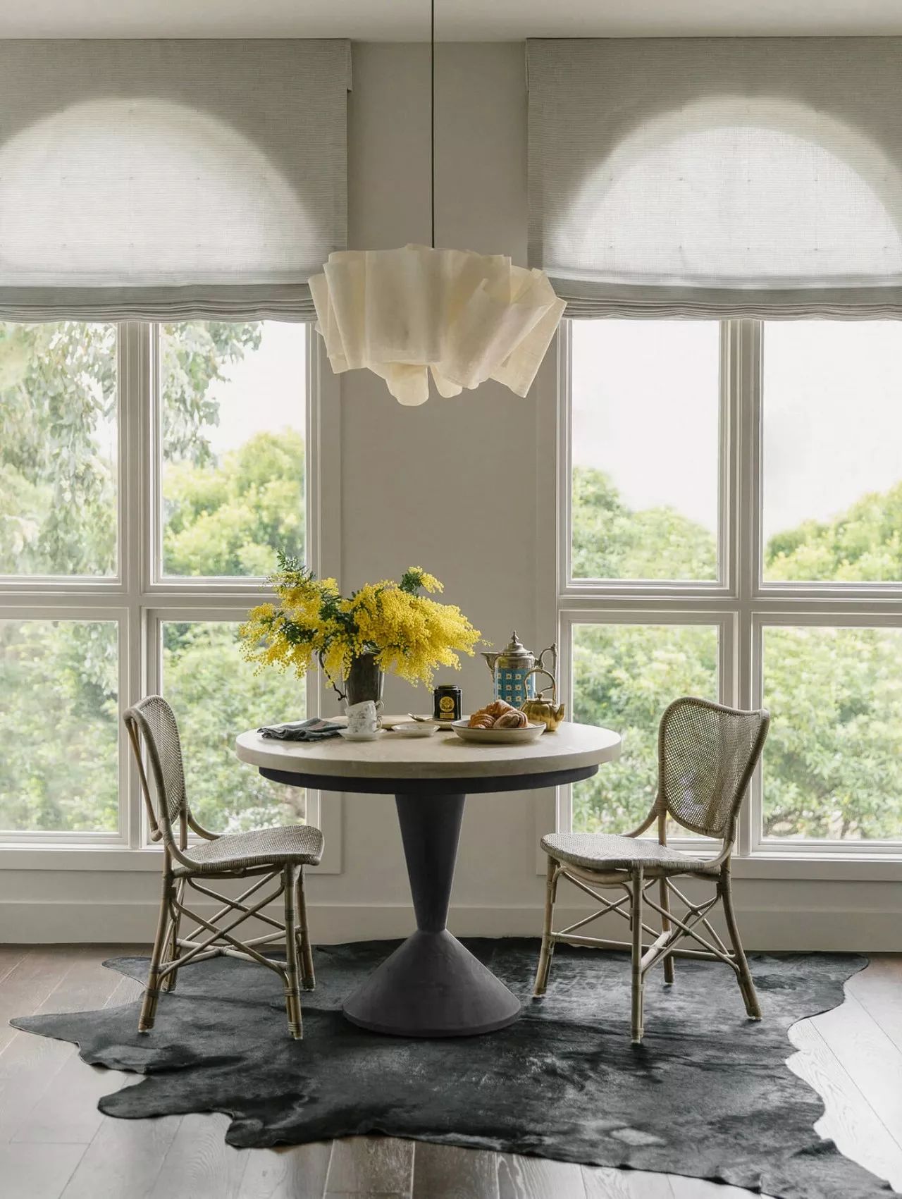 丝绸地毯和编织窗帘与宽阔的橡木地板深棕色调色板相得益彰。复古镀铬吊灯和质感灯具为娱乐空间增添了温暖的光芒。