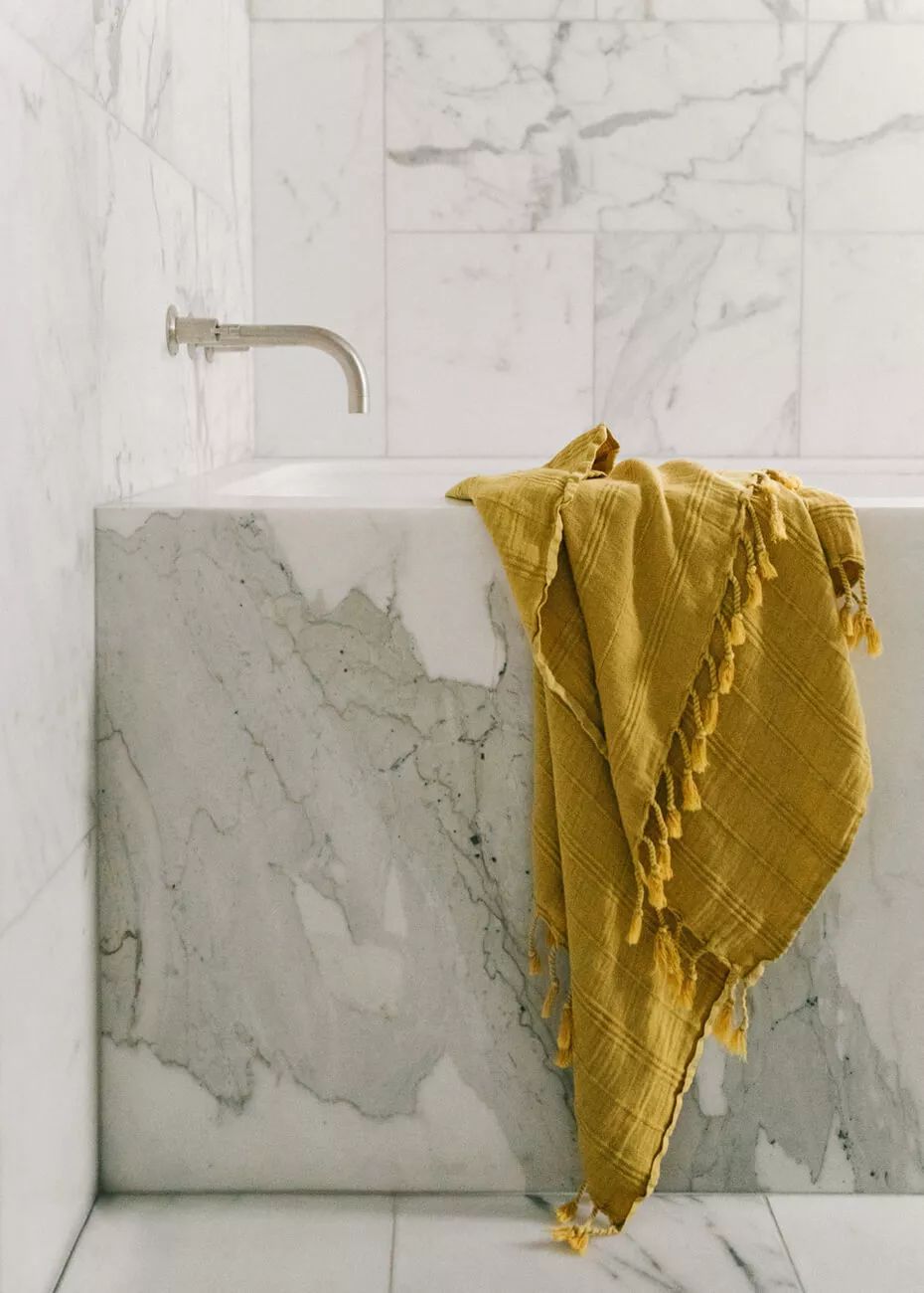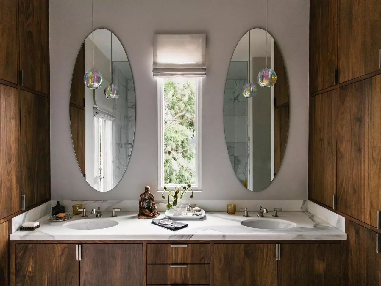 卡拉卡塔大理石,胡桃木橱柜以及灵感来自海湾景观的精致奶油色,蓝色和薰衣草调色板,使得宁静的主浴室成为房屋其他部分的恢复和奢华。