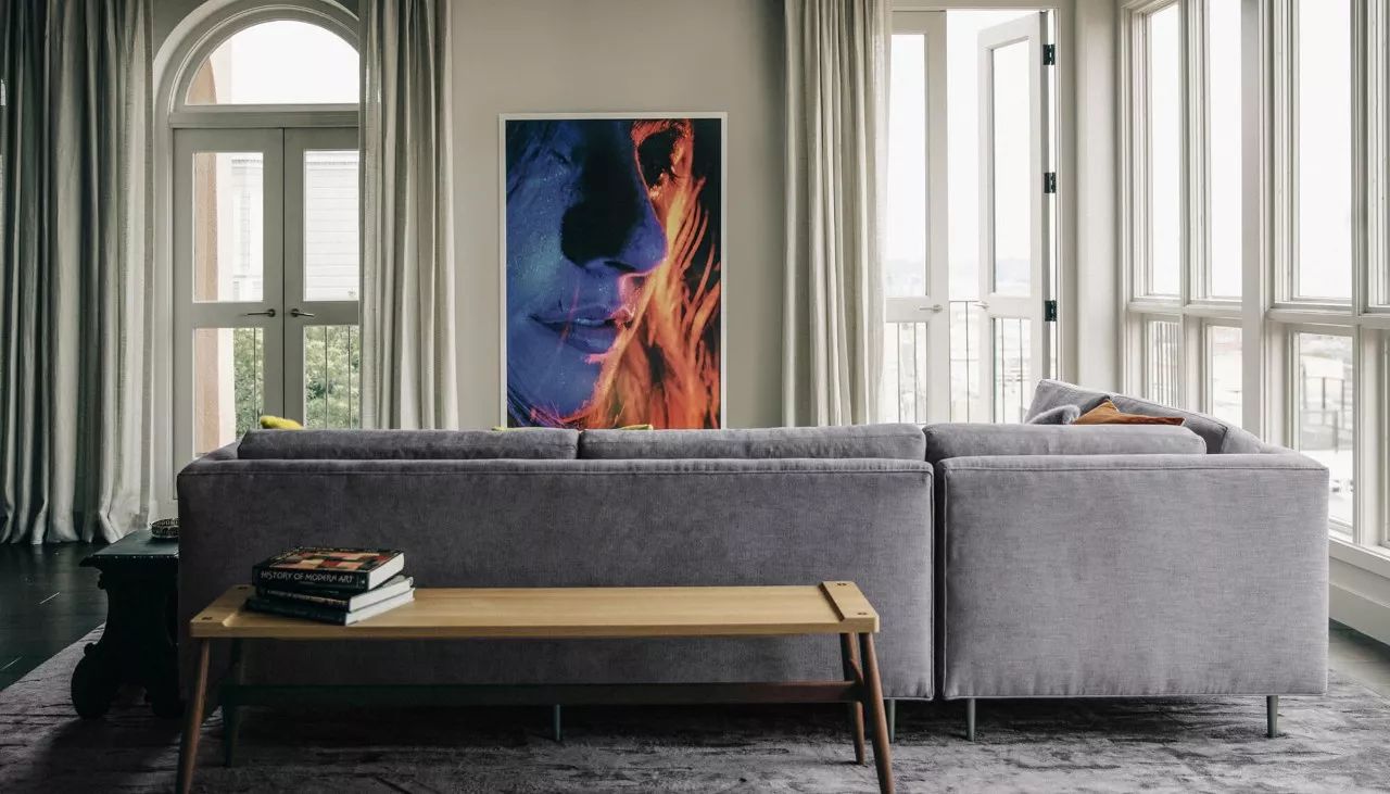 宽阔木板橡木地板在天花板上镜像,使得宏客厅感觉沉静而温馨