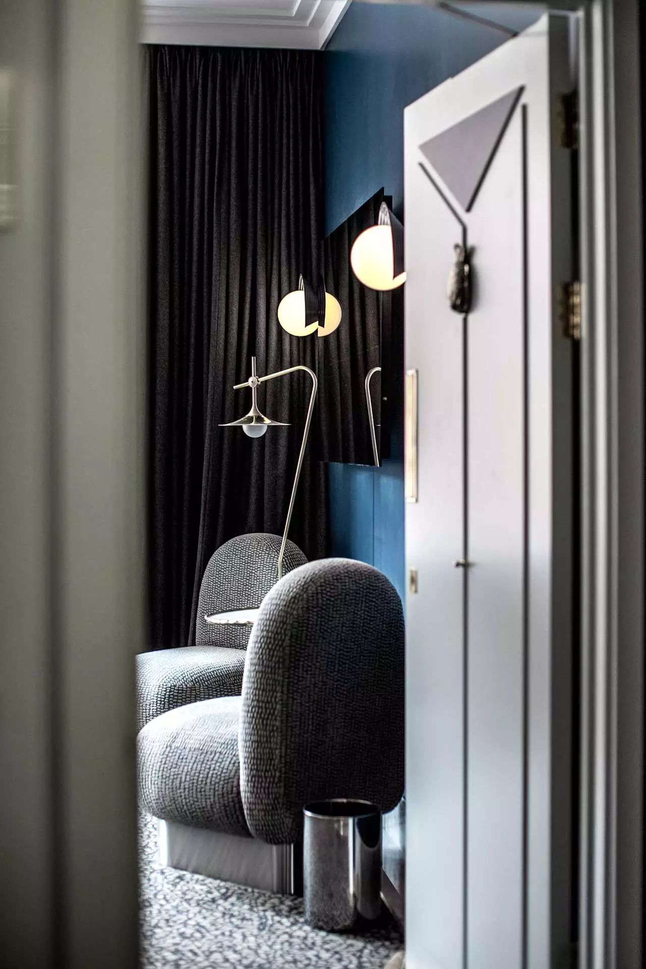 灰泥装饰和镜面与70年代Chzon的招牌风格相结合,融合了Pierre Paulin风格的扶手椅和黄铜灯以及由白色大理石裙边框起的水磨石地毯图案。作为Chzon作品的另一个主要元素,床头板点缀着着名的米兰入口通道的迷人几何形状,并佩戴威尼斯动力大厅Rubelli的面料。