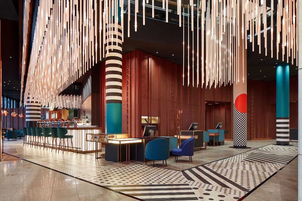 接待柜台还重复整个室内的几何形状。根据美居标准,为残疾人提供了一个高架和另一个 - 稍低一点。六角形的酒吧矗立在大堂的中央 。