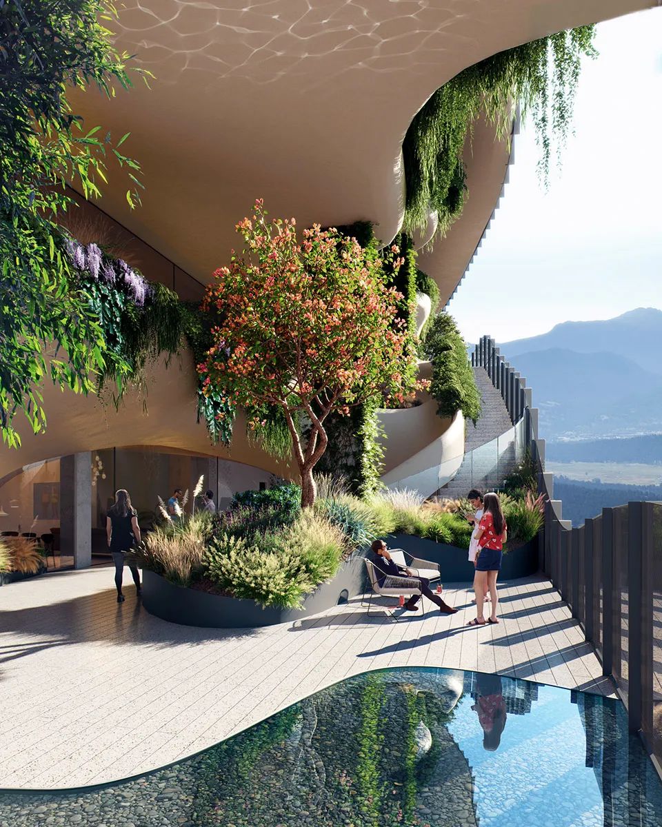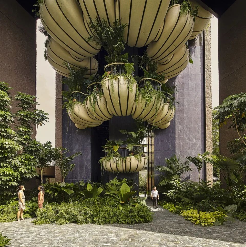 建筑中通过一系列悬垂的“花槽”从18米高的壮观大堂空间向上生长,形成宽敞且私密的户外空间。