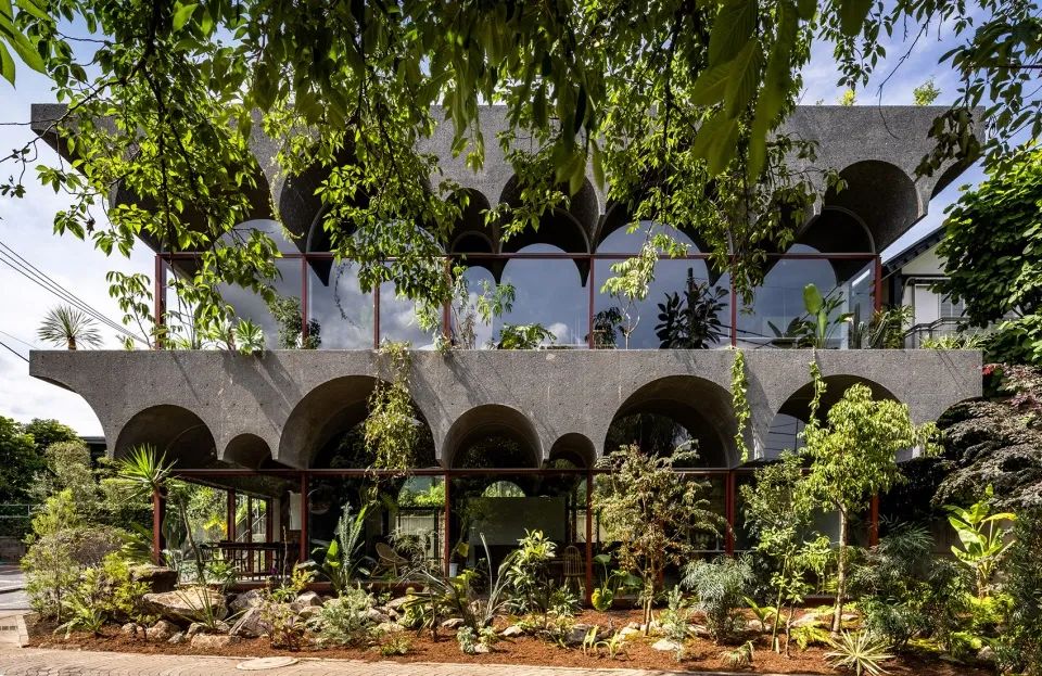 在树木繁茂的热带环境中,打造了不同于玻璃和钢铁大厦的全新建筑类型。