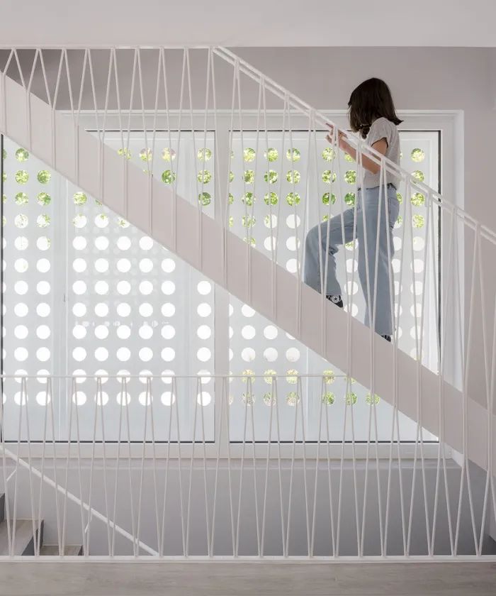 大型穿孔金属滑动百叶窗创造光线微妙通透感