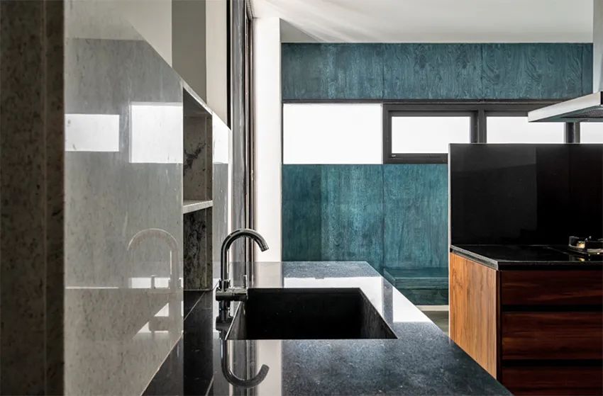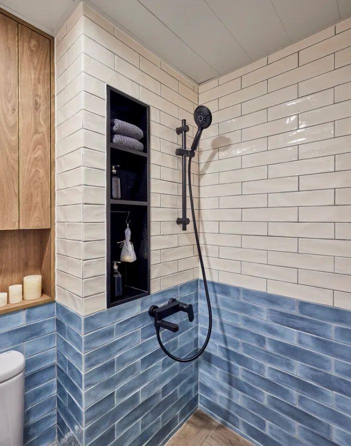 而在卫浴及厨房可见一抹水蓝色的地铁砖