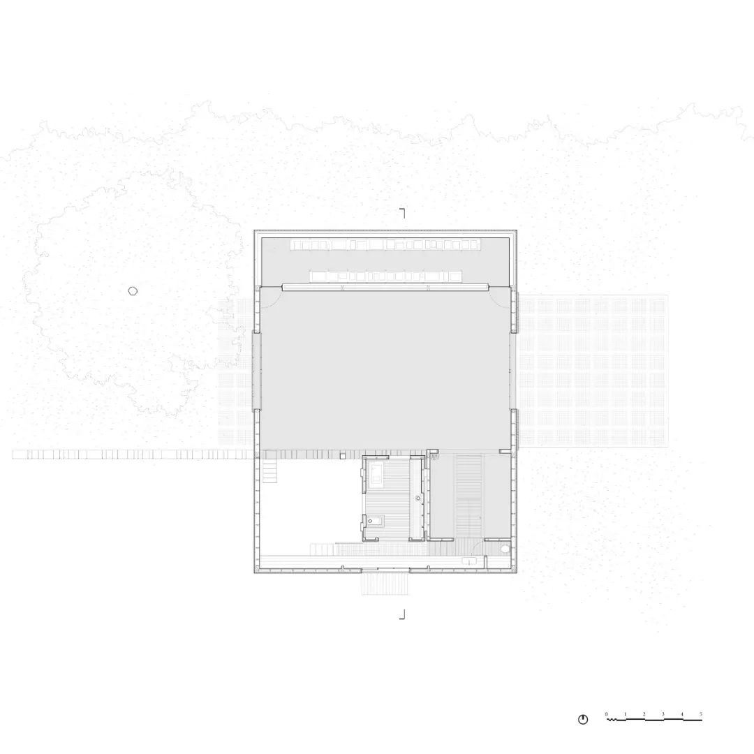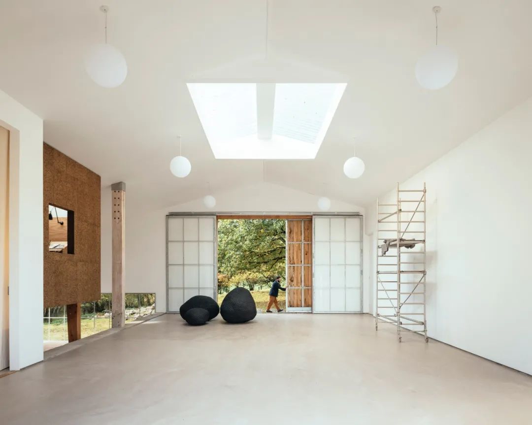 进入到室内,中央的天窗也带来了充足的光线,两旁点缀有白色球形吊灯,形成开放简约的视觉效果。在 Art Barn 内部分为三个不同的区域,满足档案馆、存储和工作室空间的不同环境要求。档案室隐藏在坚固的墙壁后面,传感器控制着除湿系统,用于保护一些艺术品和文件。