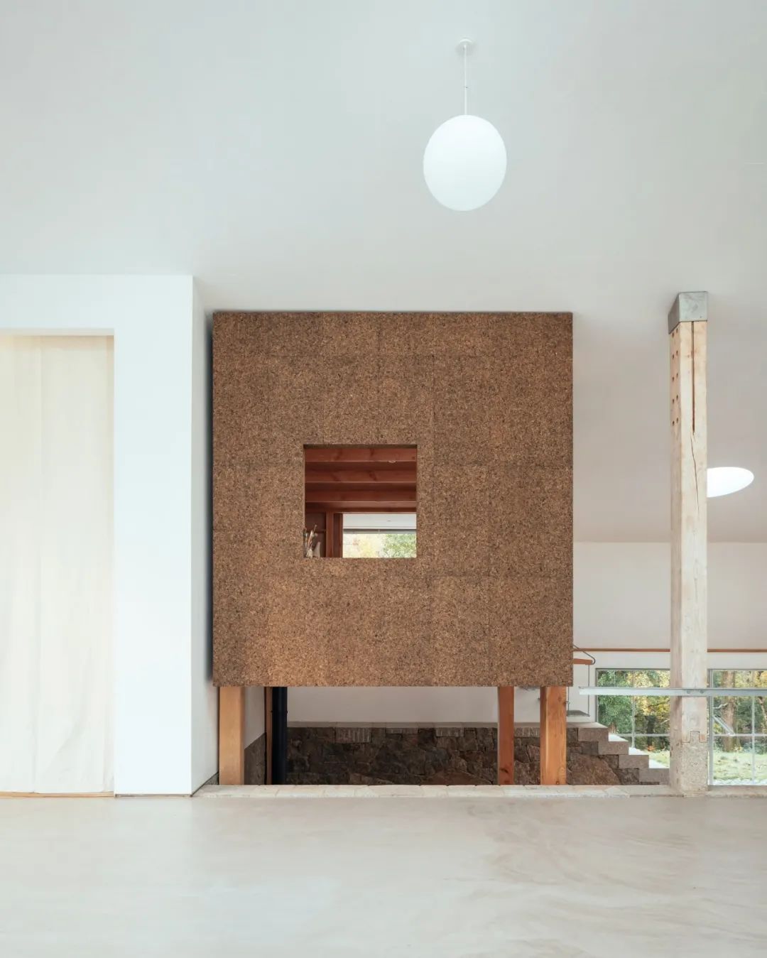 Thomas 还为他的父亲创造了一个独立的工作室结构。工作室内的一个炉子起到了加热的作用,软木板的包裹使其可以很好的保温。工作室内设有靠墙的书桌、书架,天然的木材纹理让人倍感放松。一旁的开口连接了工作室与外部的空间,让自然光线进入到工作室内。