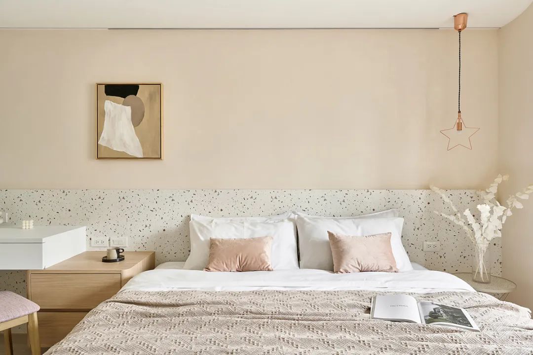 杏色壁面与水磨石床背板,共构卧眠区温润之界
