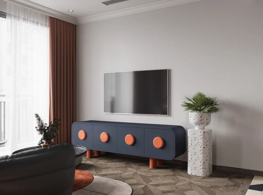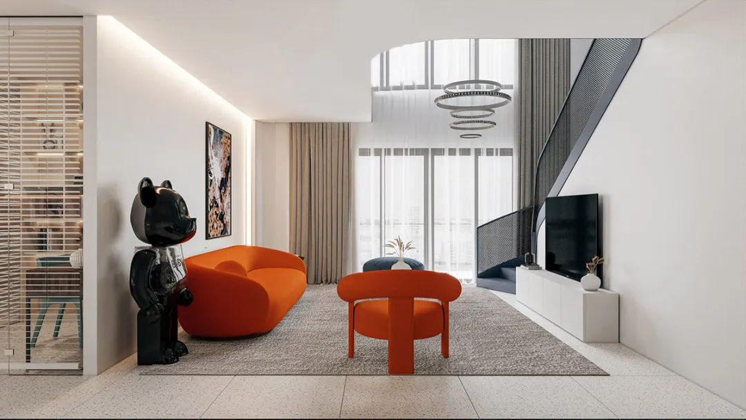 橙色休闲家具、颜色匹配的吊灯、引人注目的电视墙