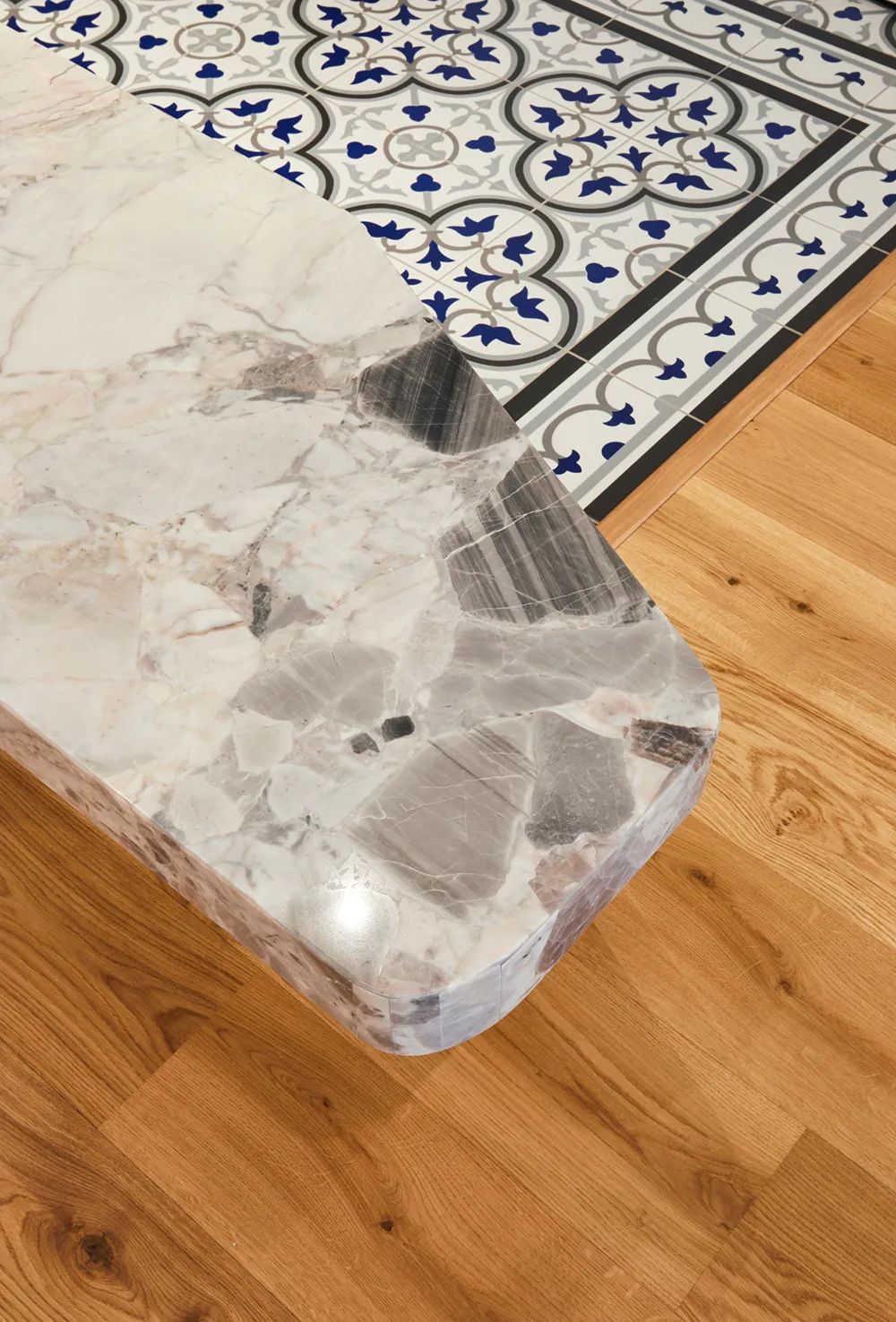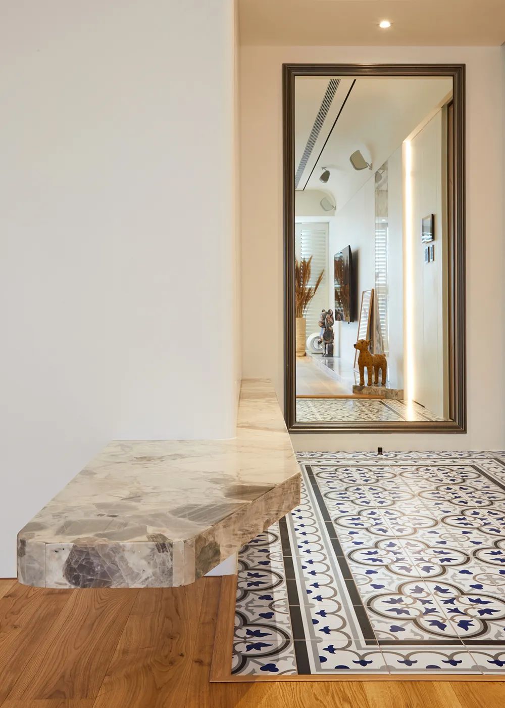 一径长形落尘区,拼贴白系与蓝形构花形地砖