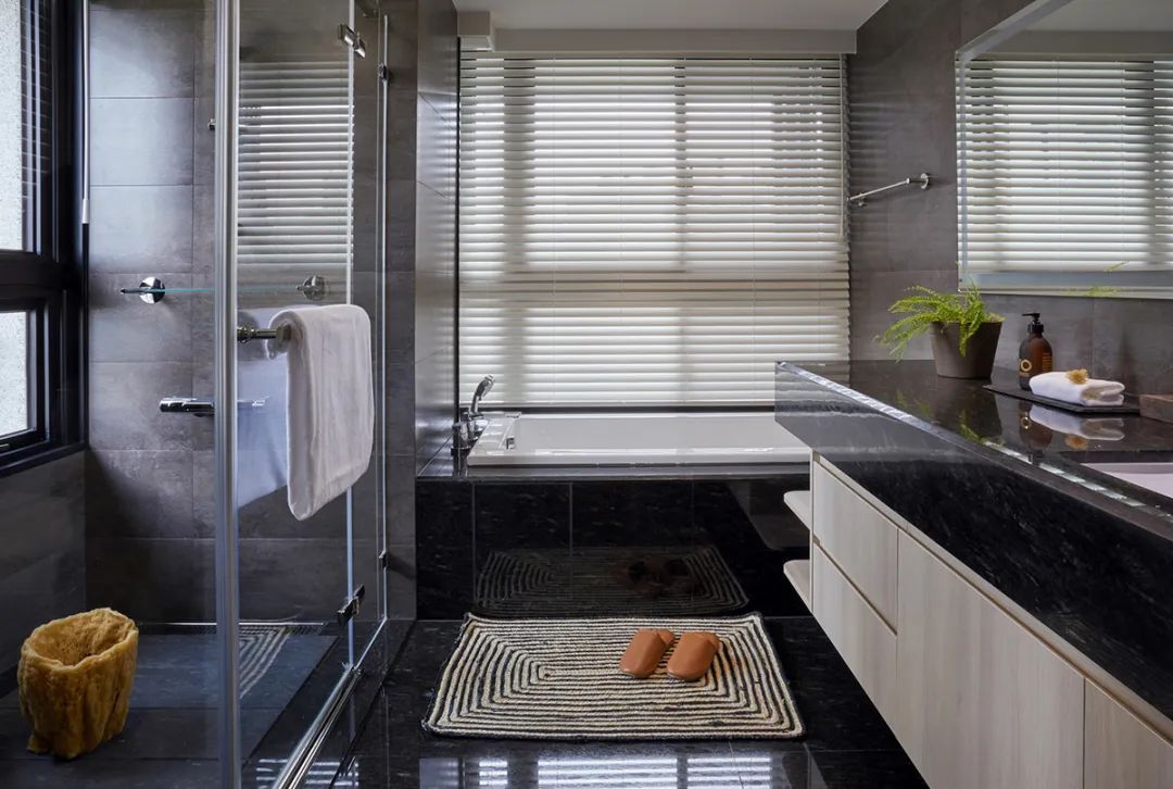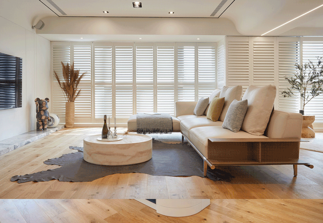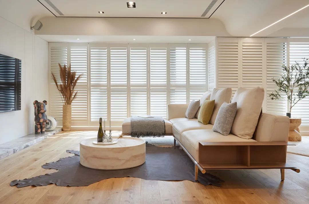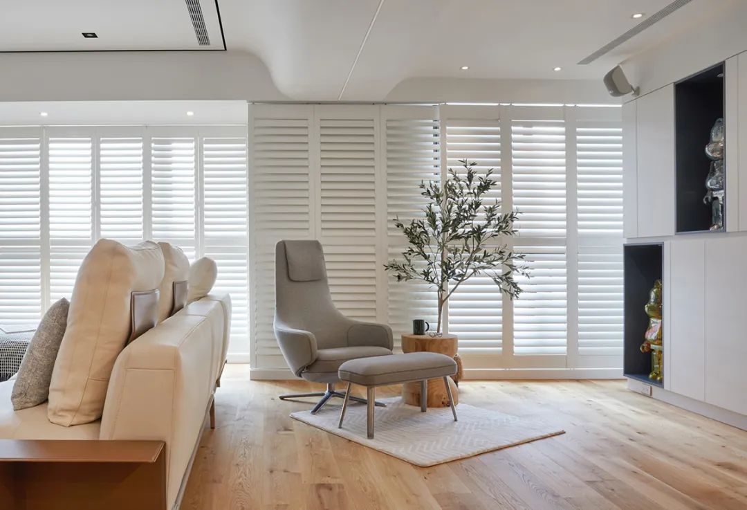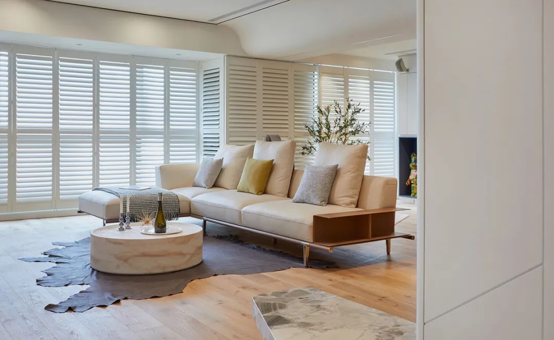 亦与马鞍皮革沙发、百叶窗形构温润之景