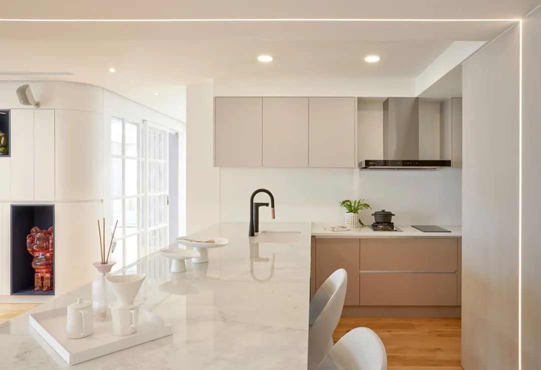 使餐厨两相结合,择以纹理素雅的白色西西里大理石